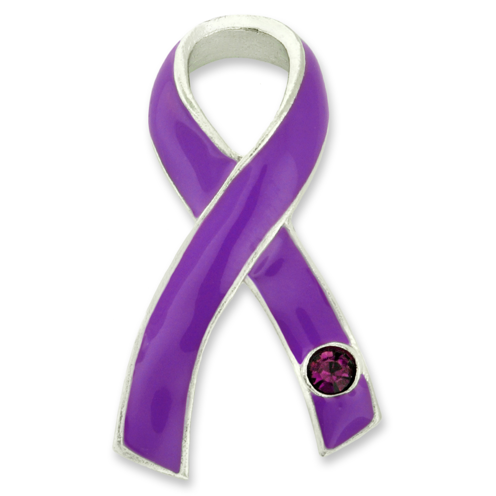 Our purple ribbon with stone lapel pin is the ideal token to raise awareness for any cause represented by the color purple. It is hand crafted in a 3D cast design, and is molded from jeweler's metal to form a beautiful awareness ribbon. It is enamel color painted, features a genuine Austrian crystal purple stone on the ribbon, is nickel plated and polished to a shiny finish. It includes a standard clutch back that keeps this pin securely in place on your garment, lanyard or ID badge. This pin makes a heartfelt gift or perfect for yourself to wear every day to support the ones you love!