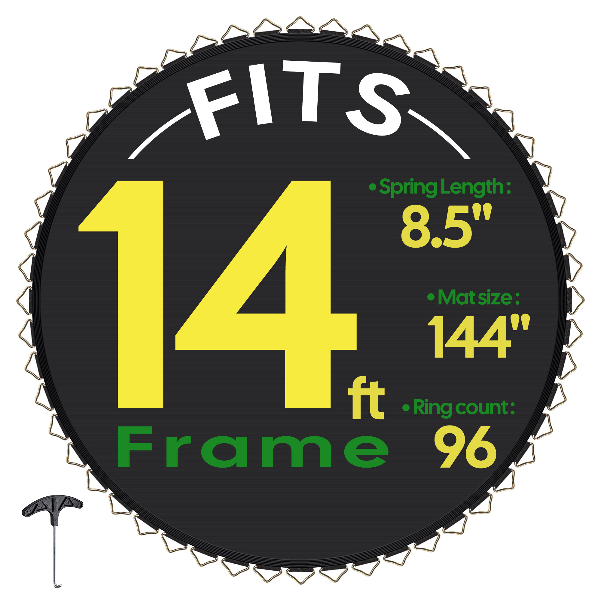 - Replace & Reuse - This Trampoline Replacement Mat is specifically designed for 14 ft round trampoline frames with 96 v-rings and 8.5" springs, allowing you to replace your worn-out or damaged trampoline mats and renew your existing trampoline without buying a new trampoline frame