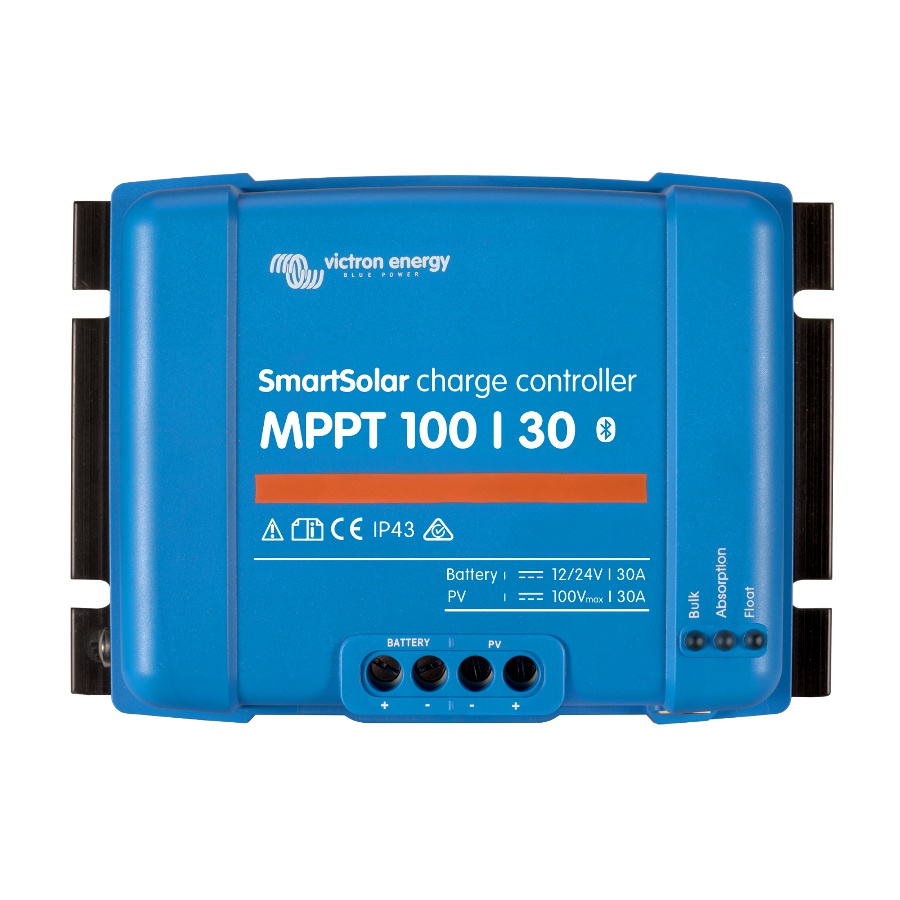 ![]() Photonic Universe is an official distributor of products from Victron Energy - the globally renowned manufacturer of high quality hybrid power electronics. Victron Energy solar charge controllers have a longstanding reputation for their outstanding reliability, innovative design and superior build quality. This Victron 100V 30A MPPT controller comes from the intelligent SmartSolar range, which uses the latest ultrafast MPPT technology to maximise energy harvest whilst maintaining optimal battery health. This SmartSolar MPPT controller uniquely features built-in Bluetooth, to allow remote system monitoring via any Bluetooth enabled device. Ultrafast MPPT Technology: This 30A MPPT solar charge controller is designed to deliver the highest possible energy yield in the shortest amount of time. This is achieved through the use of high speed Maximum Power Point Tracking technology, which tracks the maximum power voltage point of the solar panels as it varies depending on sunlight exposure and temperature. This technology enables the controller to produce up to 30% greater energy yield than PWM controllers and as much as 10% more power than slower MPPT controllers. This advanced technology allows the controller to perform extremely well in low-light or cloudy conditions, as the controller consistently strives to extract the maximum available power from the solar array. Inbuilt safety protection: Fully equipped with an extensive range of safety features, this controller offers complete protection against potential hazards such as PV short circuit, PV reverse current, PV reverse polarity and battery reverse polarity. The internal temperature sensor also protects the battery from overheating and will activate power derating if excessive temperatures are detected. The controller also has self-diagnostic capability and highlights any system errors using sophisticated fault-targeting technology. These are signalled via the high intensity LED indicators. Inbuilt Bluetooth: This SmartSolar charge controller features built-in Bluetooth which allows the user to easily connect to any Bluetooth enabled device, such as a mobile phone, tablet or iPad in order to access the VictronConnect App (no additional Bluetooth dongle required). The mobile app unlocks numerous possibilities for advanced programming and remote monitoring of your Victron SmartSolar system. Once the controller is paired with the app, a wide range of additional features are made available, including: Live data transmission: Real-time information is displayed including solar panel output, battery voltage and current (flowing into and out of the battery) as well as battery state of charge. Detailed data logs: System activity for the past 30 days is available to view; either as in-depth daily logs or as a monthly summary. These easy-view graphics display daily energy yield, maximum recorded power and voltage, time spent in each charging stage, minimum and maximum recorded battery voltages, error records and total energy counters. The VictronConnect App is also available to download as a PC version, for computers without Bluetooth connectivity. If you would like to use the PC version of the app to monitor/program your SmartSolar system, this controller can be connected to your PC via a VE Direct USB Cable (sold separately). Optional Remote LCD Display: The user can connect an optional MPPT Control panel (sold separately) to the controller to access a range of monitoring and programming functions. The display shows charging parameters (voltage, current, power) for the solar panel, battery and load, as well as 30 day performance data. The user can also adjust the load settings and specifically set the duration and voltage of each charging stage. Other features: The Victron SmartSolar MPPT 100/30 model is ideal for a wide range of applications as it is resistant to extreme temperatures, high altitudes, dusty environments and marine environments. The unit enclosure is IP43 water resistant with resin encapsulation of the internal electrical components and has a PD3 pollution rating. This solar charge controller is also compatible with a wide range of battery types, including AGM, Gel, Tubular plate and Lithium batteries. Specifications: