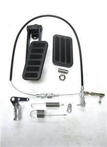 This listing is for a brand new BLACK extra large street rod gas pedal pad, a BLACK brake or clutch pad, a braided stainless steel throttle cabel assembly with 24" BLACK housing, and throttle cable brake and spring kit.