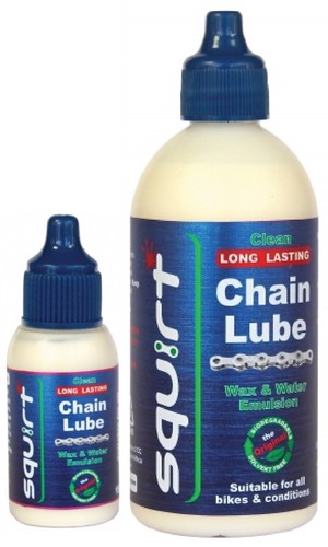 Squirt is a unique chain lubricant – it contains waxes and water in emulsion form that stays clean, lasts long and extends drive train life. It is 100% biodegradable