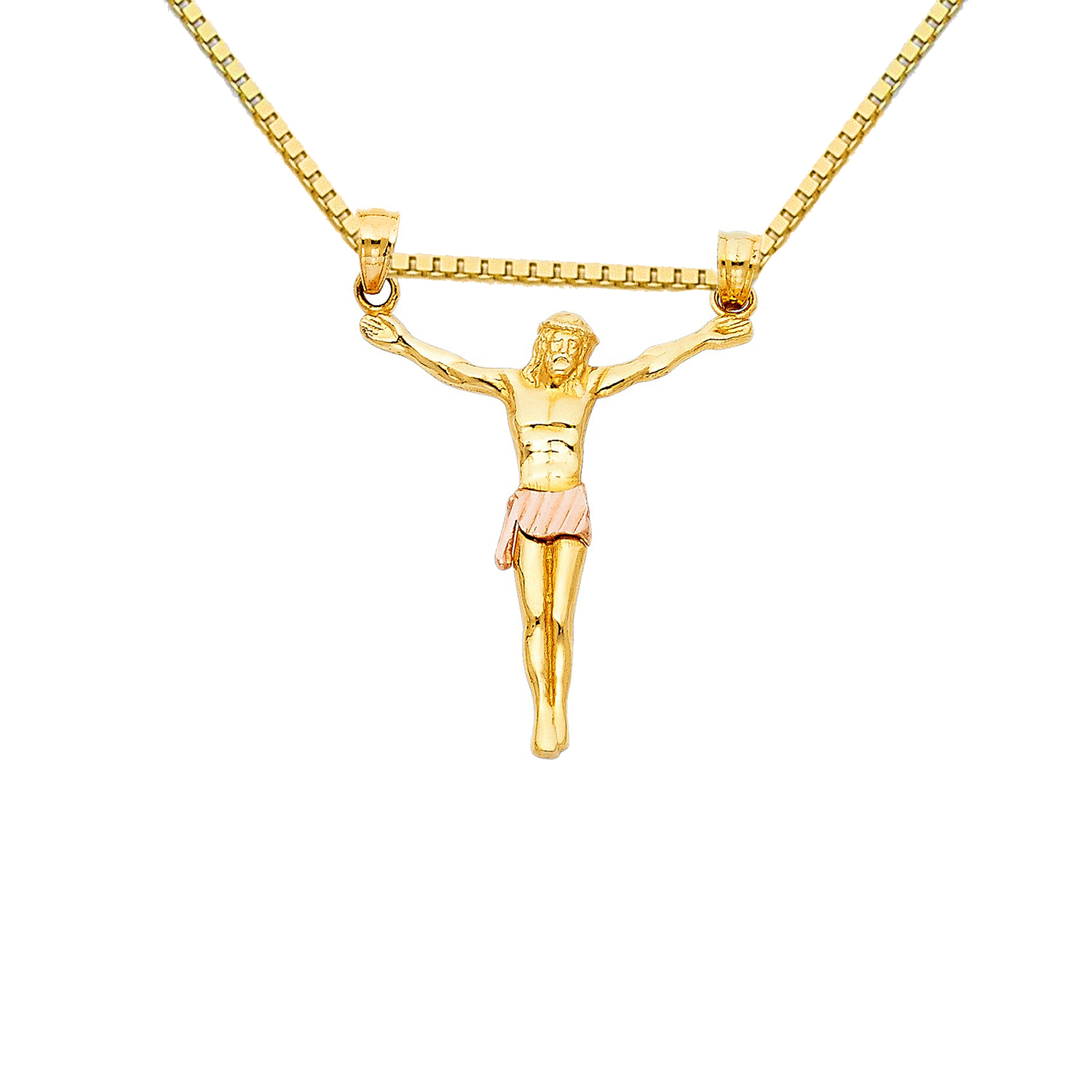This exquisite pendant is a true testament to craftsmanship, expertly fashioned from radiant 14-karat yellow gold, beautifully accented with rose gold. With two bails gracefully suspended from Jesus' outstretched arms, this pendant is designed to rest elegantly on a chain of your choice. Its lightweight hollow back ensures that it feels comfortable against your skin, making it perfect for daily wear. Measuring 1.25 inches in length, this pendant draws the eye and sparkles with every movement. Accompanied by a delicate 14k yellow gold box chain, you can select your ideal length from 16 to 24 inches. The pendant details reveal a stunning width and length of 13 mm, while its total weight of approximately 1.4 grams highlights its featherlight charm. Every element, from the hollow back design to the choice of chain length, has been meticulously considered for your comfort and style. The chain itself features a traditional box design, with a width of 0.80 mm, and varies in weight by length; the options include 2 grams for 16 inches all the way to 2.9 grams for 24 inches. Secured with a lobster claw clasp, this necklace is a beautiful fusion of faith and elegance, perfect for anyone who cherishes religious jewelry and seeks to express their beliefs through gold.