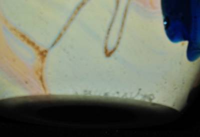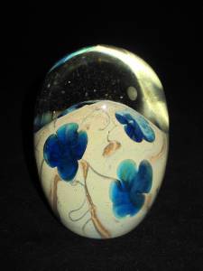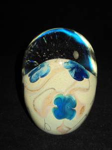 You have found the missing pieces to your art glass collection! Here is an oval shaped paperweight signed J Byron/78. The base is light blue with blue flowers. The top is clear with tiny bubbles. 4 1/2" tall by 3 1/4" wide, it's in excellent used condition, no chips or cracks. Please see our other listings for more art glass.