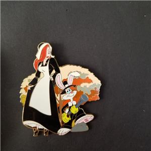 Jessica takes her first high-heeled steps in her new country while Roger is on the lookout for food. Jessica is wearing a long black dress with white apron, and Roger is carrying a blunderbuss gun - he has one foot on a rock/stone. The background is a tree in autumn colors of yellow, orange, gold and green. Released for the Thanksgiving holiday. Imported, Enamel cloisonné, Gold-finish. 3" H Limited Edition of 500 © Disney / Amblin