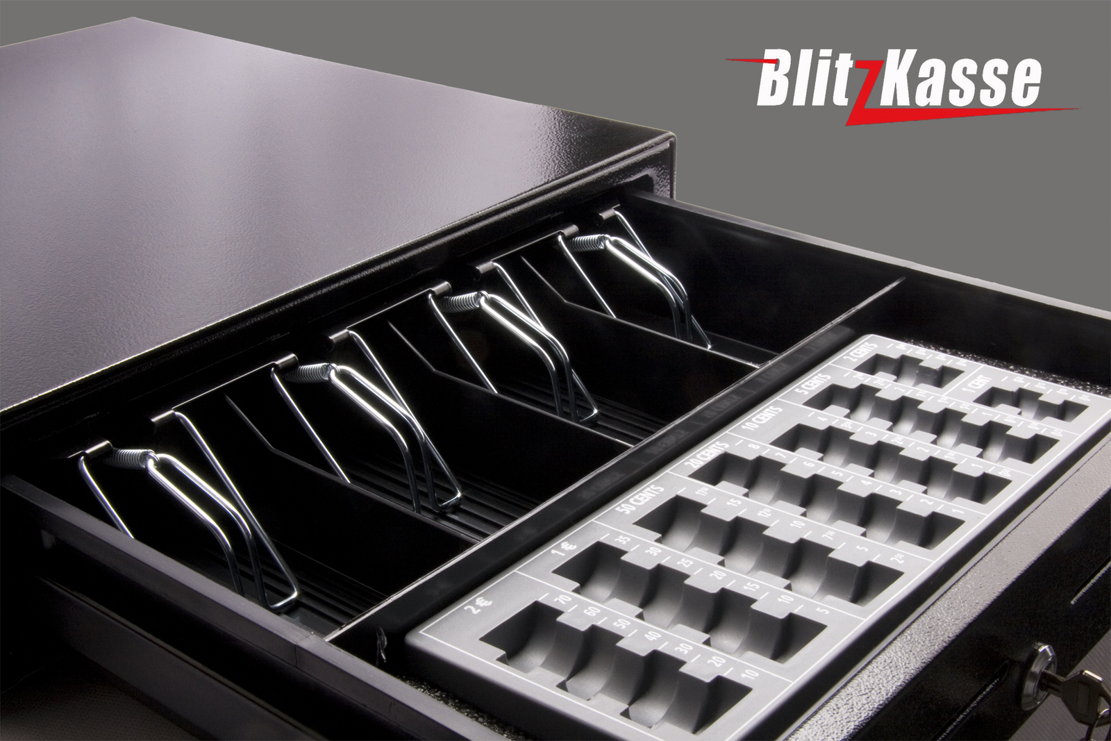 - Fächer: 4 verstellbare Geldscheinfächer mit Metallniederhaltebügel, 8 Münzfächer, Schein und Münzfäch herausnehmbar, Auszug auf Kunststoffrollen