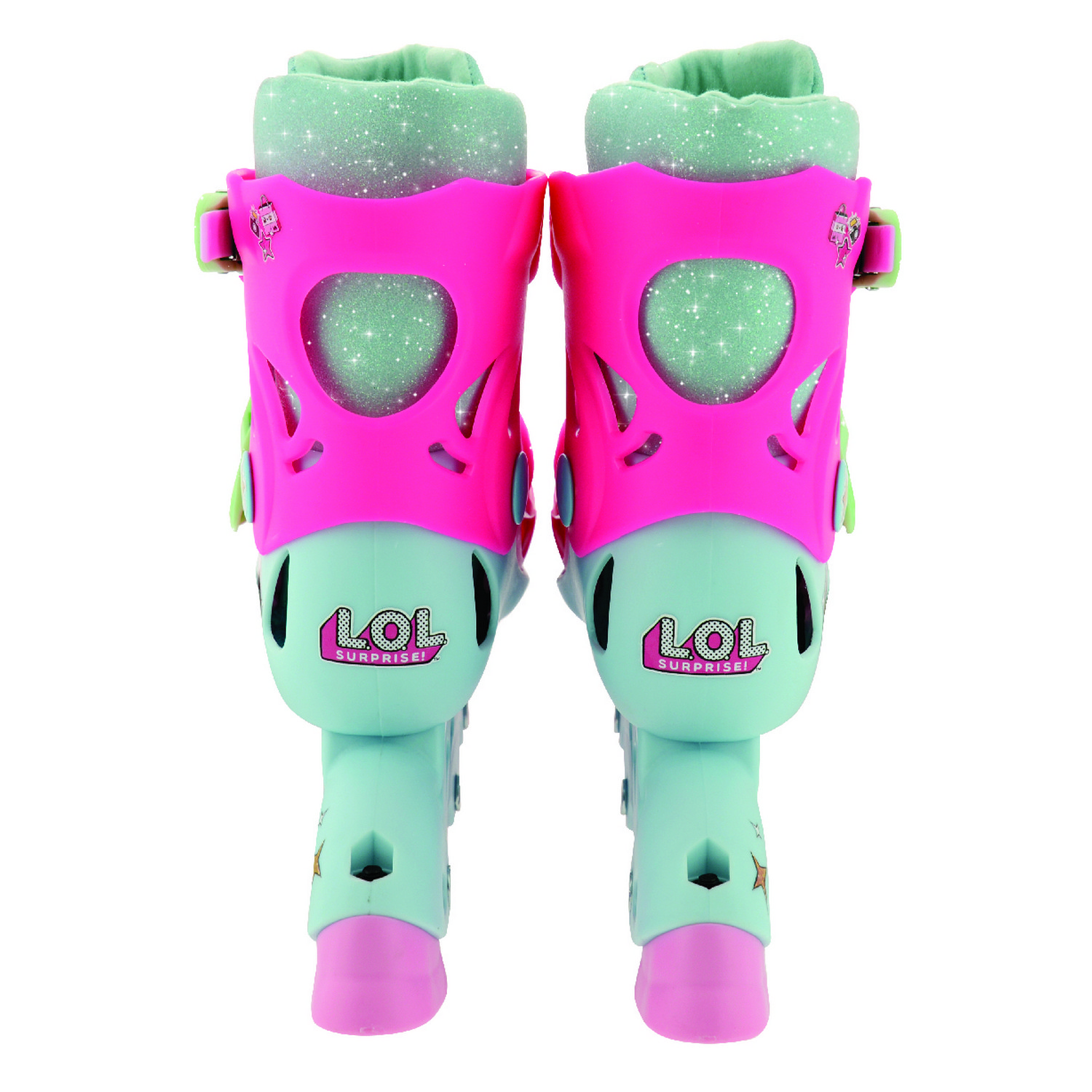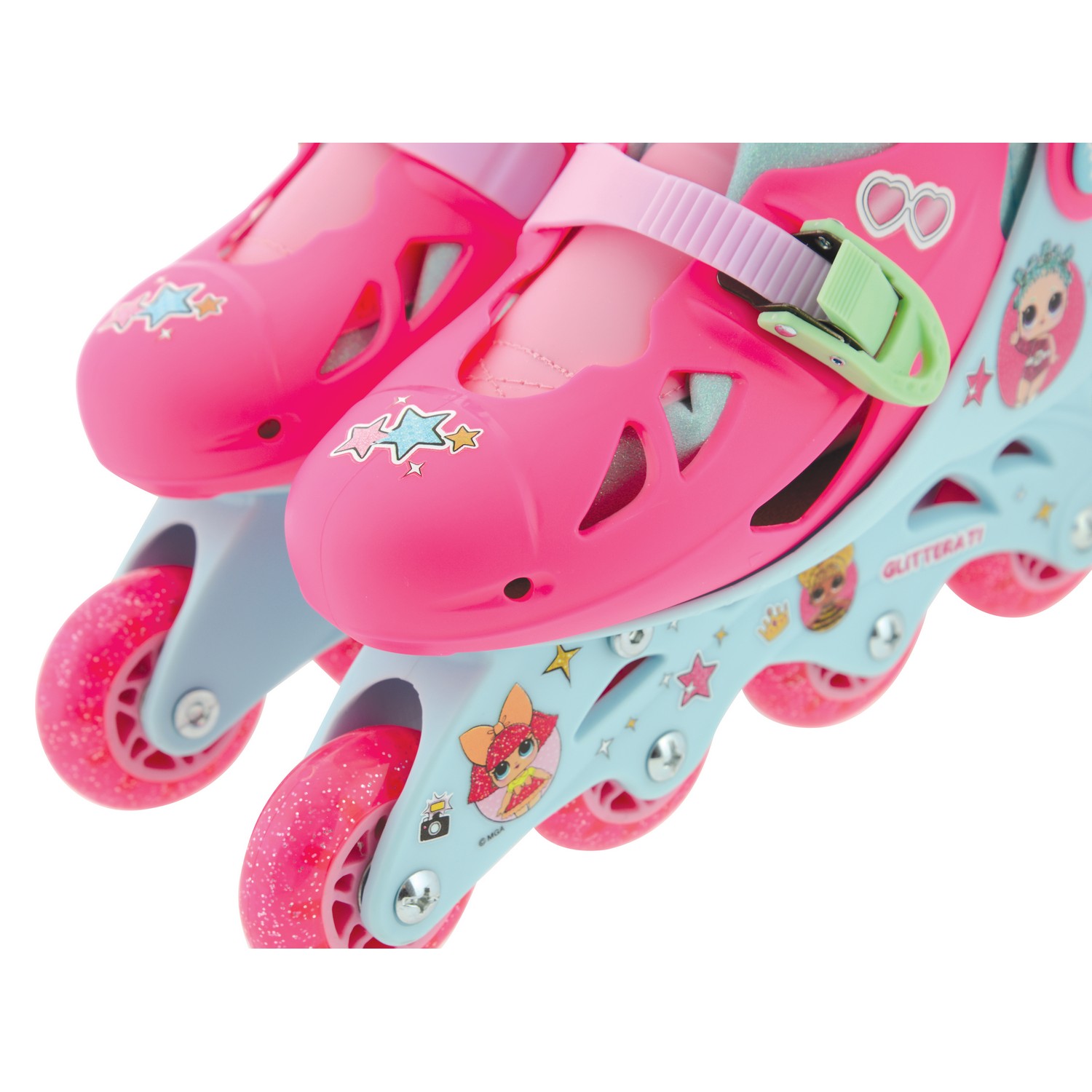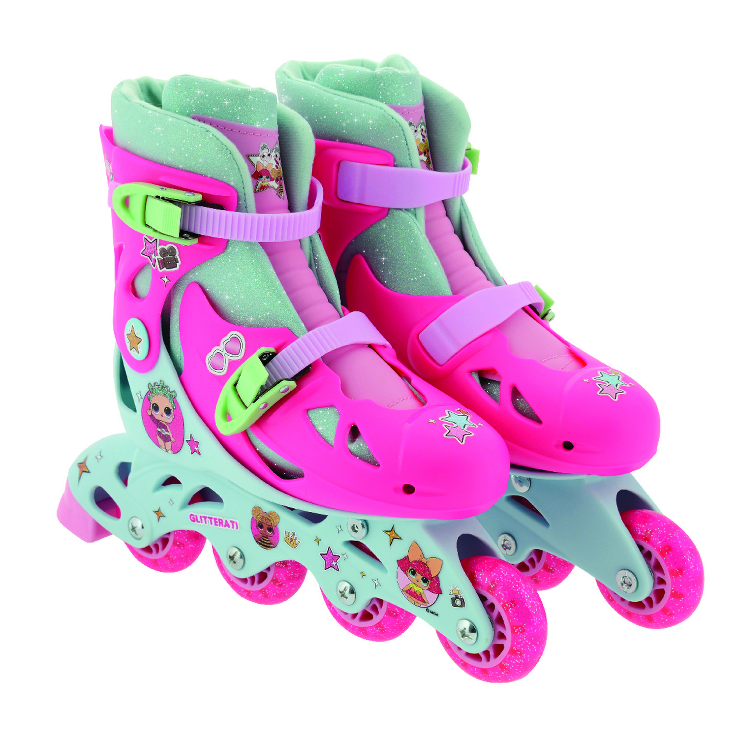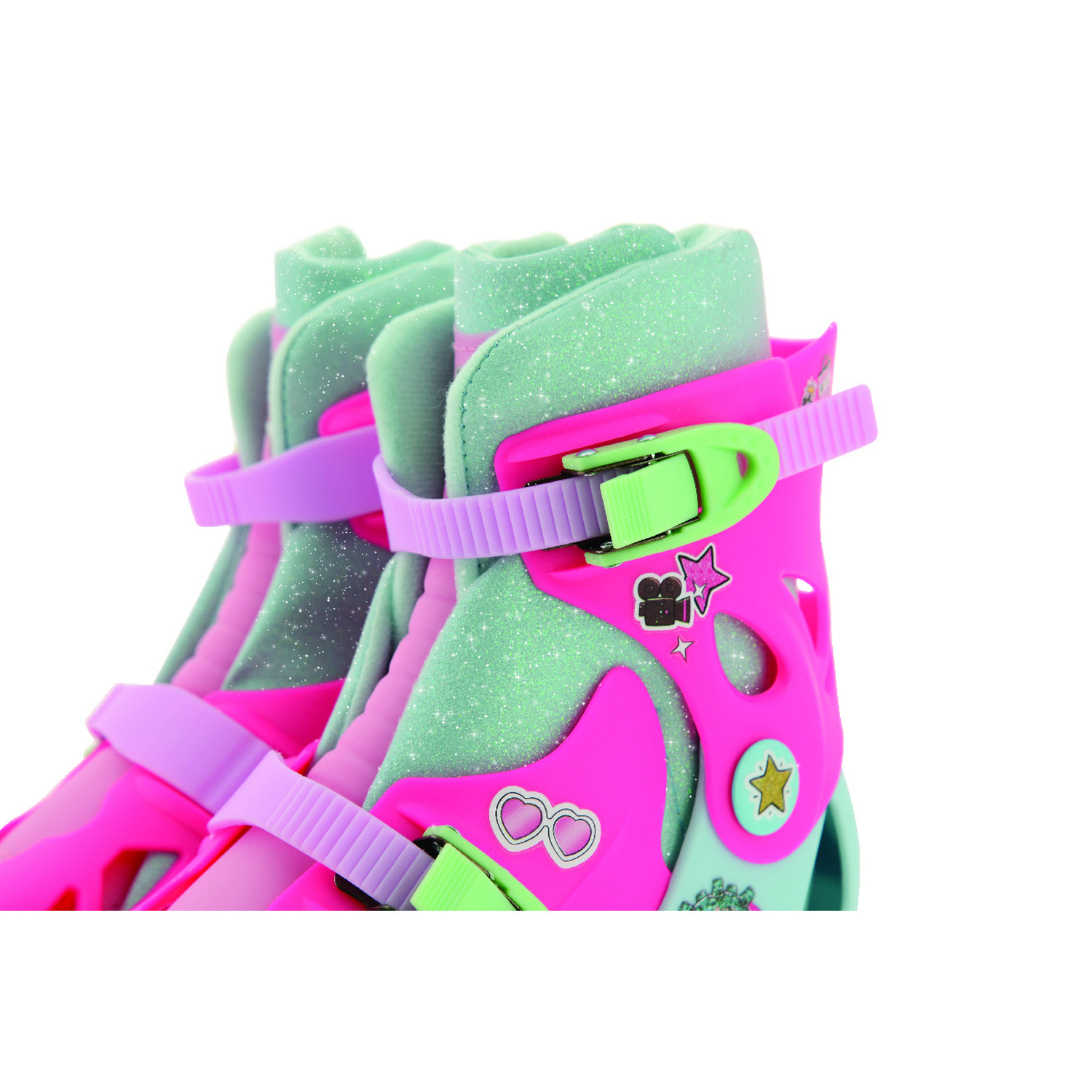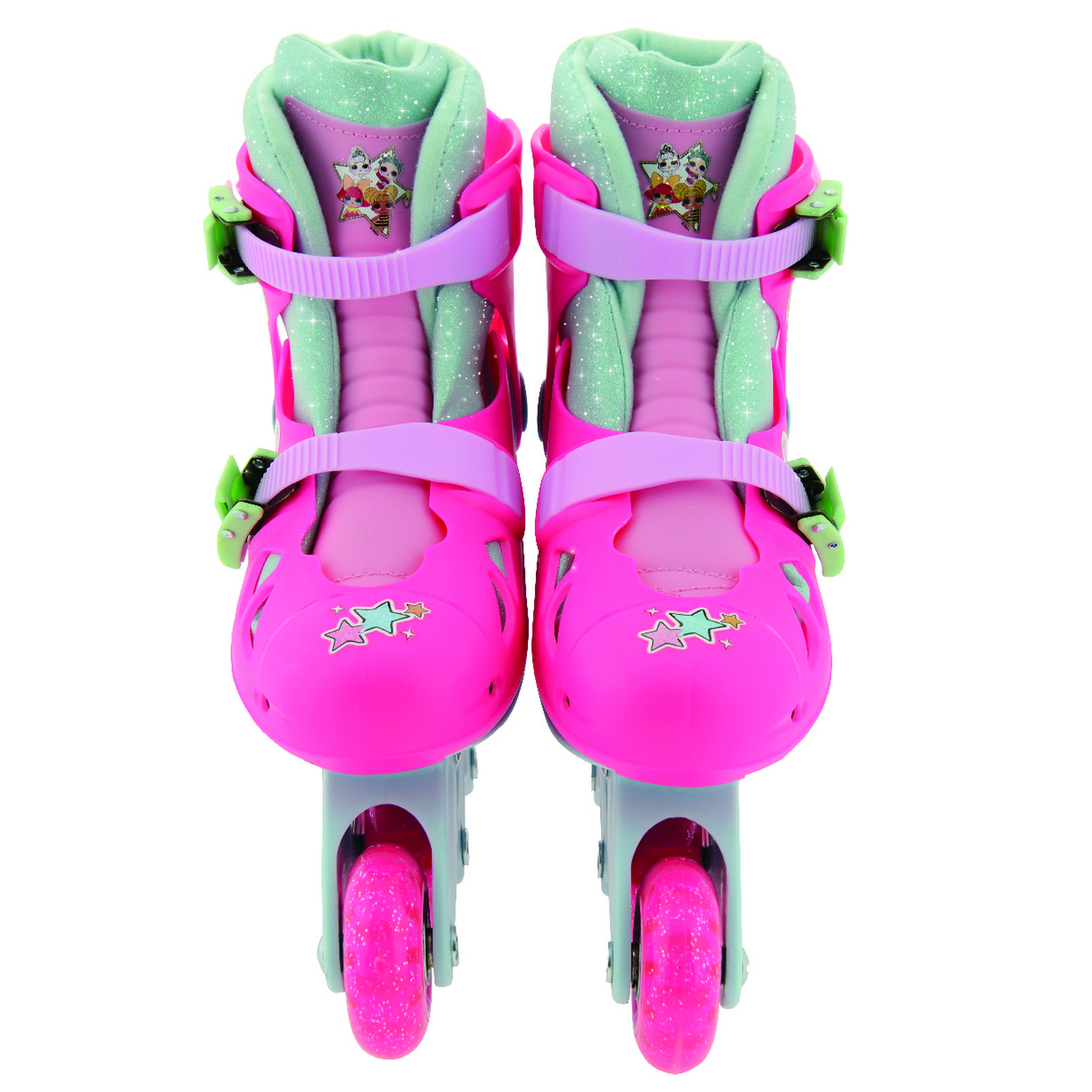 Double, easy ratchet adjusting straps for a secure fit. Easy push-button adjustment across 4 sizes. Pivoting heel cuff flexes with the foot for improved comfort and support. Comfortably padded glitter sock. Durable PP shell. Glitter PVC wheels with 608z bearings. Durable rear brake block. Character graphics. Glitter sticker sheet included for rider customisation. Shoe size 13J-3.