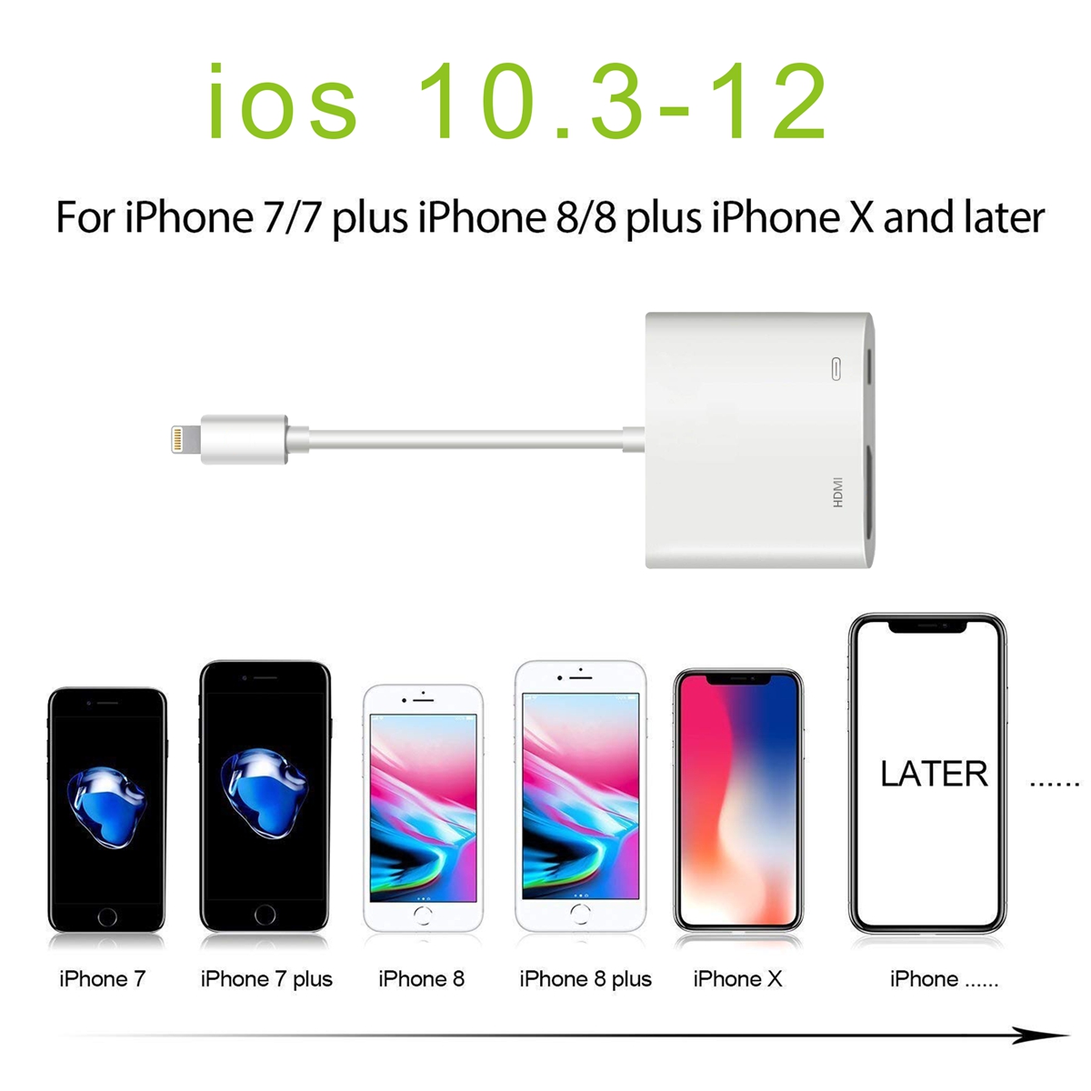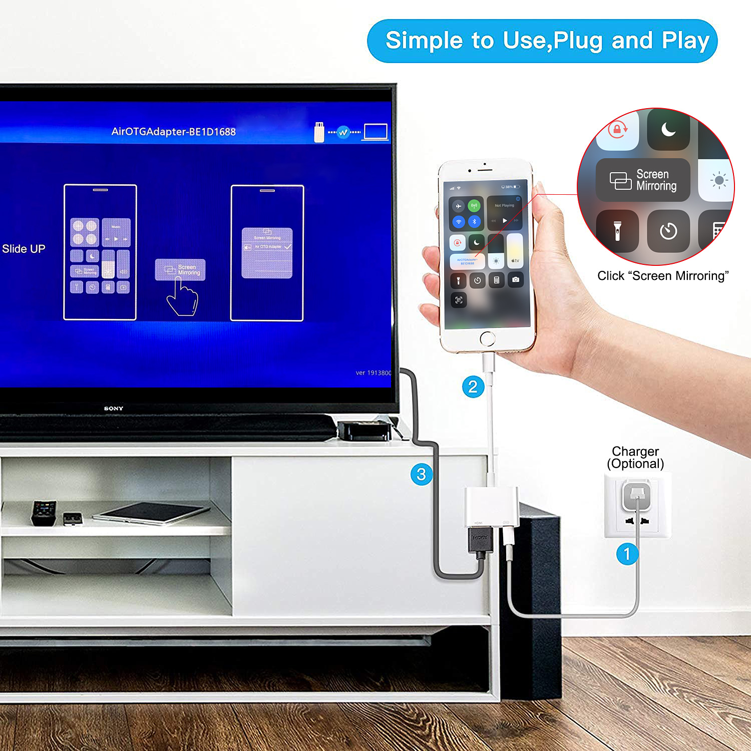 - Plug and Play Technology: Easy installation within 2 minutes, Step 1 Have shorter than 10ft hdmi 2.0 cable connected without extra adapter between this adapter and your TV/Monitor; Step 2 Make sure you have setted your TV into "HDMI"Channel and once the right corner of the TV Screen showed connected, have click " Screen Mirroring"on your phone to work.( Please have shorter than 10FT hdmi 2.0 cable connnected and you only need have the extra Apple original charging cord connected this adapter when you need your iPhone/iPad to be charged when mirror the screen.)