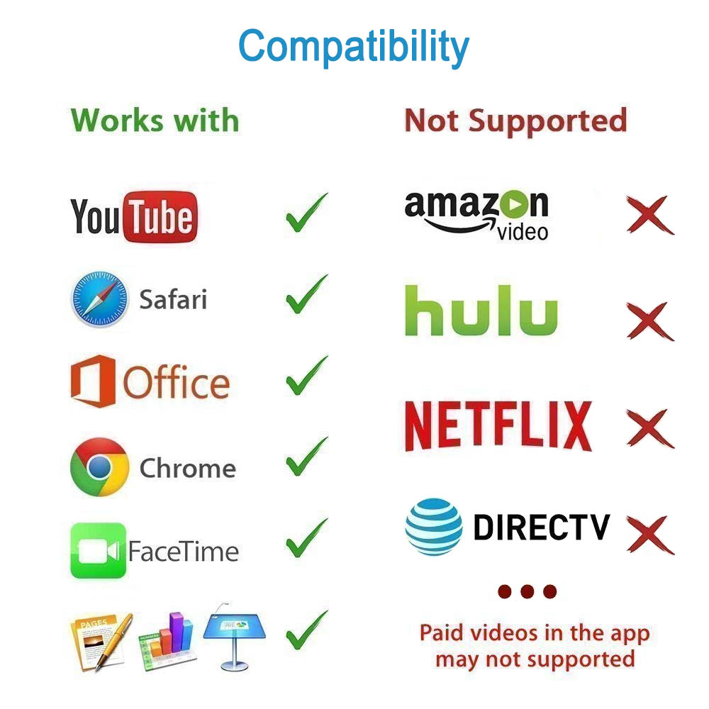 - NOT SUPPORT: APPs which have "HDCP" video copyrights protection like Netflix, Amazon video, HBO go, HULU, SKY Q and Honda motor. Please check it before purchasing.