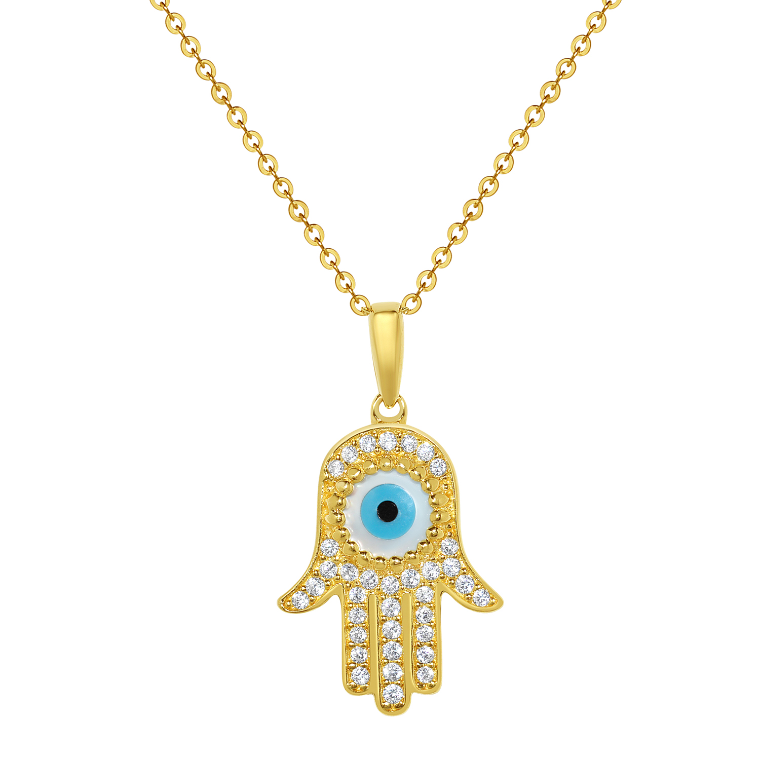 Genuine 14k Yellow Gold CZ Evil Eye Hamsa Hand of Fatima Pendant 17+1" Necklace