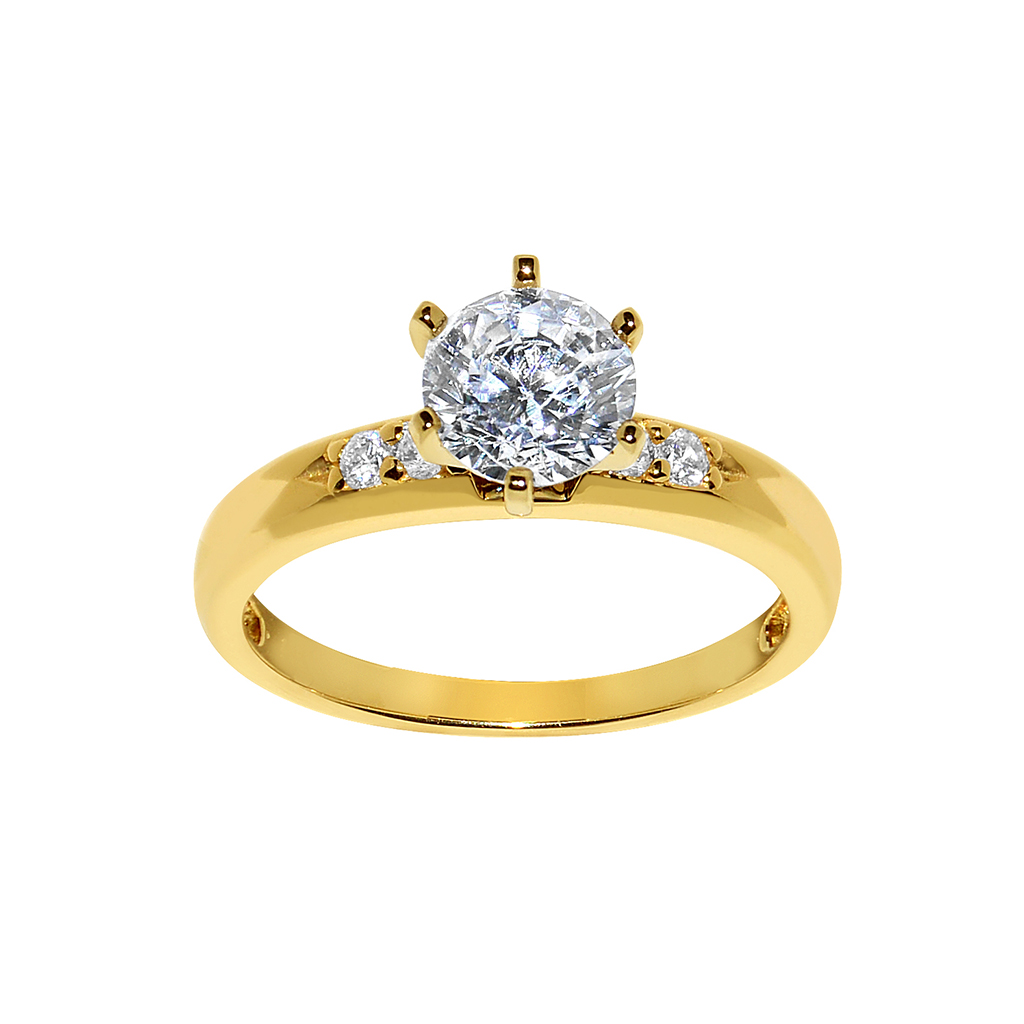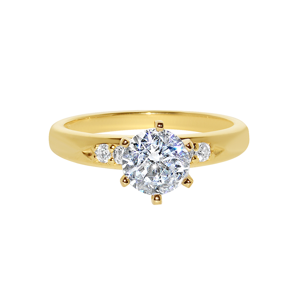 This exquisite ring is crafted from 14k yellow gold and showcases a fiery round-cut Diamonette - Diamond Simulant center stone, secured in a six-prong setting. The band is adorned with two round-cut side stones on each side, adding a touch of sparkle to this classic design. The Diamonette boasts a carat weight equivalent to a 1.1-carat natural diamond, making it a stunning centerpiece. The central Diamonette cubic zirconia is 6.5 mm in diameter, held securely in a prong setting. The side stones, also Diamonette cubic zirconia, measure 1.9 mm and 1.8 mm each, enhancing the overall brilliance of the ring. The ring is meticulously finished with a high polish, reflecting light beautifully. Crafted of 14k yellow gold, the band measures 2.5 mm in width. It's important to note that all carat weights and measurements are approximate and may vary slightly from the listed dimensions. This engagement ring is a timeless piece, ideal for women seeking a sophisticated and sparkling statement. The high-quality Diamonette cubic zirconia, with its close resemblance to a natural diamond, offers a beautiful and affordable alternative.