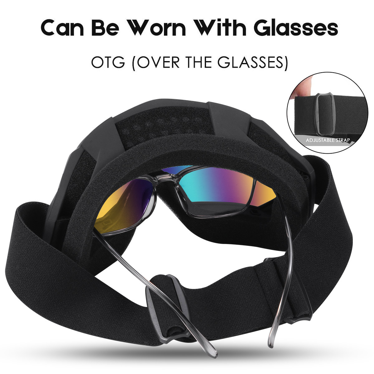 - OTG (OVER-THE-GLASSES) DESIGN - The Ski Goggles PRO features an OTG design that lets you wear your glasses under the goggles. All lenses are ANTI-FOG COATED & offers 100% UV400 PROTECTION.