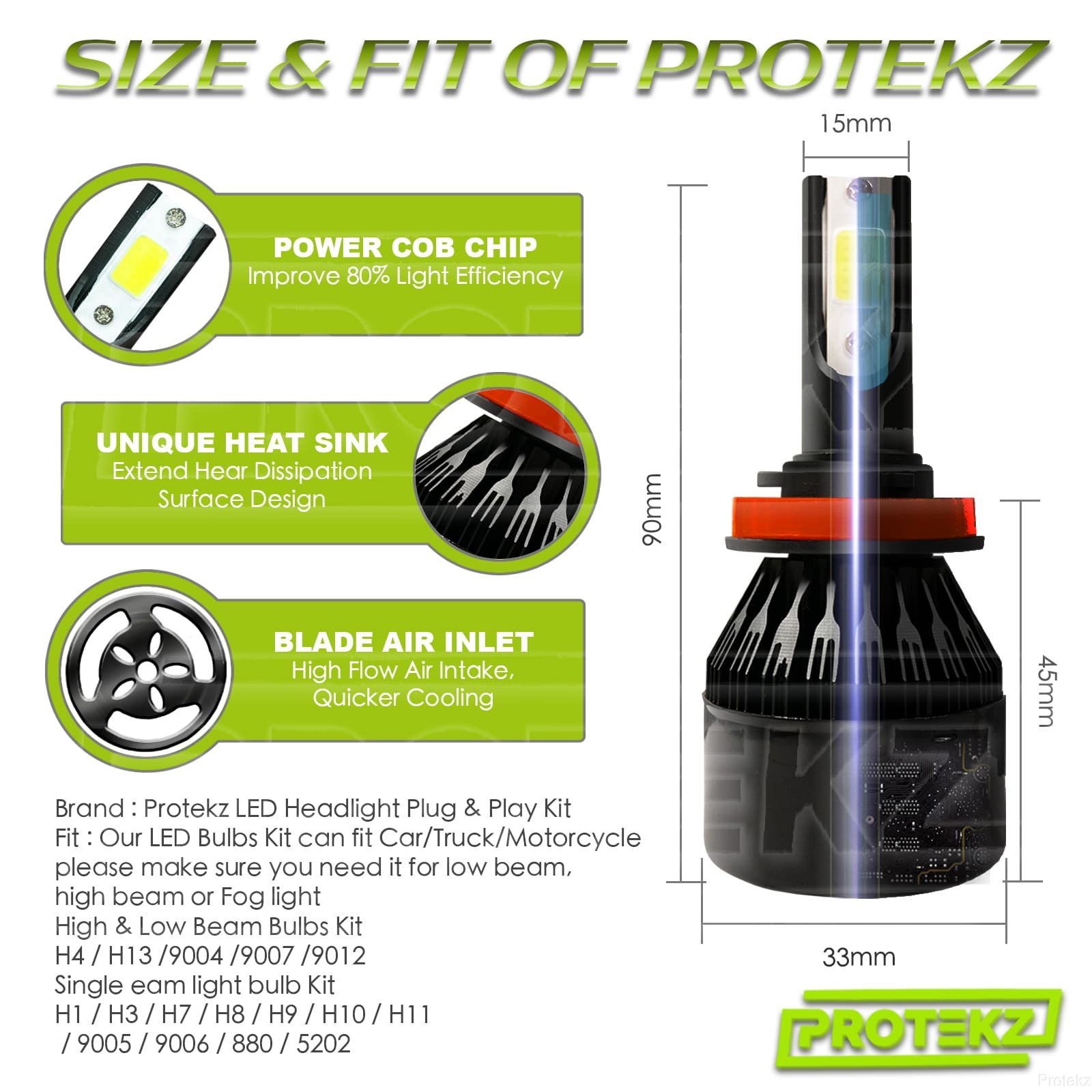 Brand New ★ Product Advantages ★ High brightness ★ High temperature resistant ★ High purity of luminescence ★ Good stable performance ★ Instant on fast cooling ★ Energy saving environmental ★ Long lifespan(>50000hr) ★ Interchange Part Number: Use for high Beam, Low Beam, DRL or Fog Lights… ★ LED Type: 2Pcs Led Chips Each Bulb ★ Other Part Number: 6000K(Xenon HID Pure White) Head Light Lamp Bulbs ★ Beam Angle: 360 Degrees ★ Placement on Vehicle: Left, Right, Front ★ Heat Control: Aluminum shell base including Turbo cool fan ★ Warranty: Yes ★ The latest design of the led headlight , whose luminous point is the same as the factory light, thus beam Pattern is flawless. The compatibility table is only for reference, please make sure to verify the bulb type of your vehicle before purchasing. We are happy to help if you need any further information. Features: 1.Each Bulb have 2 sides of Super Bright LED Chips 2.Complete Kit: No Other Ballast/Driver Required Just Plug and Play - Newest Technology 3.Beam Angel: 360 Degrees 4.Color Temperature: 6000K Pure White 5.Smart Efficient Cooling System, Built-In Cooling Fans For Fast Heat Dissipation 6.High quality Aluminum heat dissipation ensures the secure temperature range 7.Low Power Consumption than Halogen bulb or Hid Kit, Energy Saving 8.Low Voltage Protection, High Precision Constant Current driver Chip 9.Shakeproof and Long lasting up to 50,000 Hours. 10.Easy installation, Plug and Play, NO modification required 11.Operating Temperature: -40°C ~ +80°C
