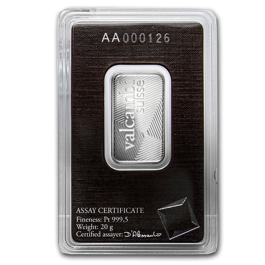 Each bar is stamped with a unique serial number and is an ideal choice for investors looking to efficiently add to their Platinum bullion holdings. Add this exquisite 20 gram Valcambi Platinum bar to your cart today!