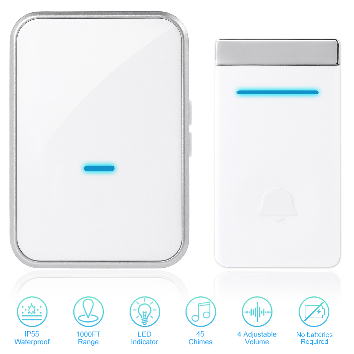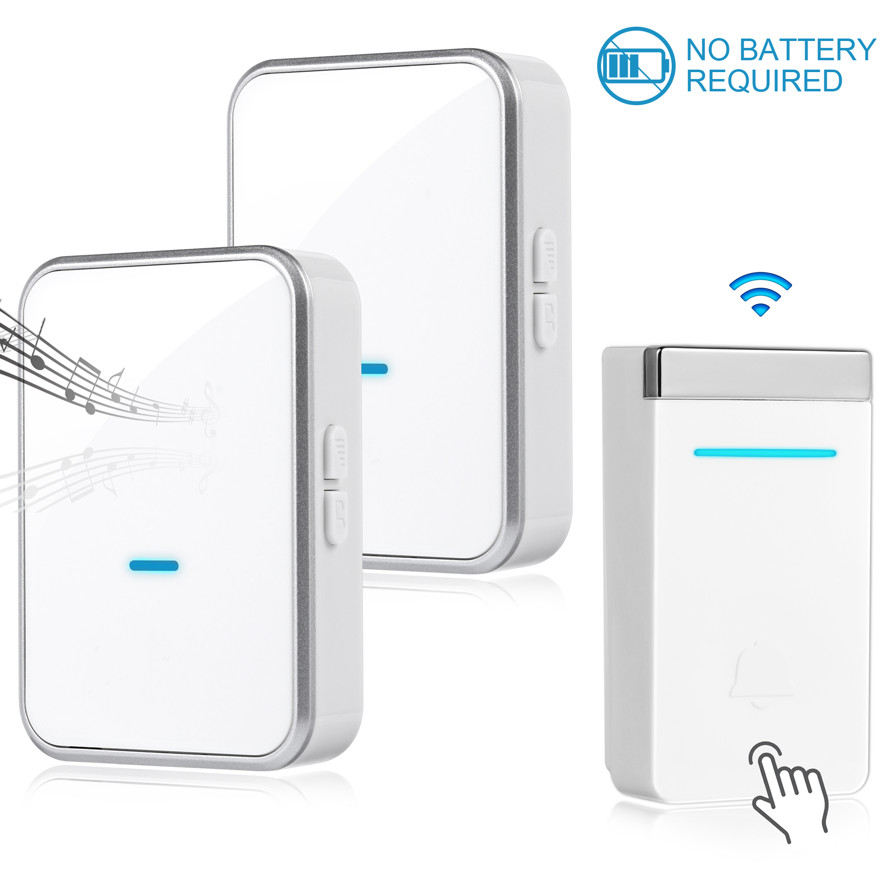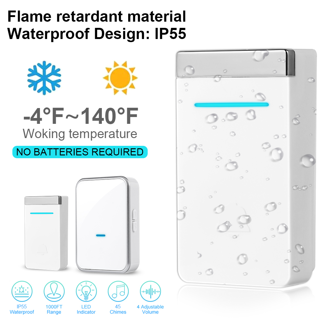 - No Battery Required - The wireless doorbell never need battery for use. Self-powered push button converts kinetic force into electric energy, no batteries required.