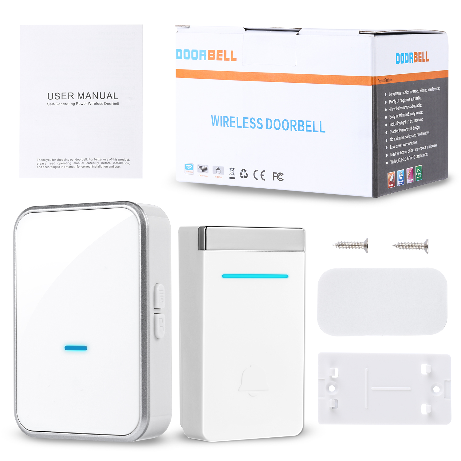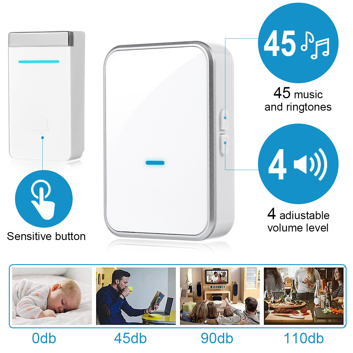- Multiple Volume Option - There are 45 different ring tones with 4 levels of adjustable volume from 0 dB to 110 dB. Flashing light with audio alert indicators which is easy for people including the hearing impaired to notice. The self powered doorbell has CE, FCC,RoHS certifications.