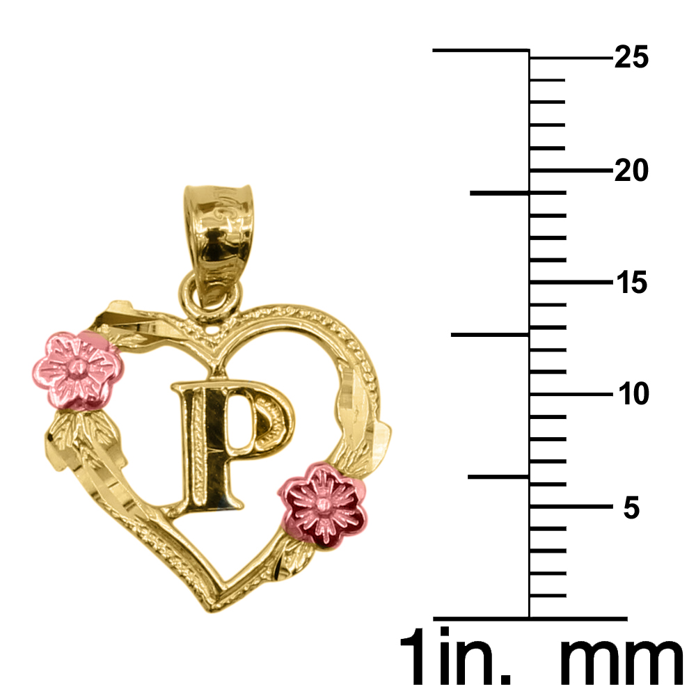 Genuine 14k Two-tone Gold 0.66" Floral Heart Initial P Pendant Necklace 16"-22"
