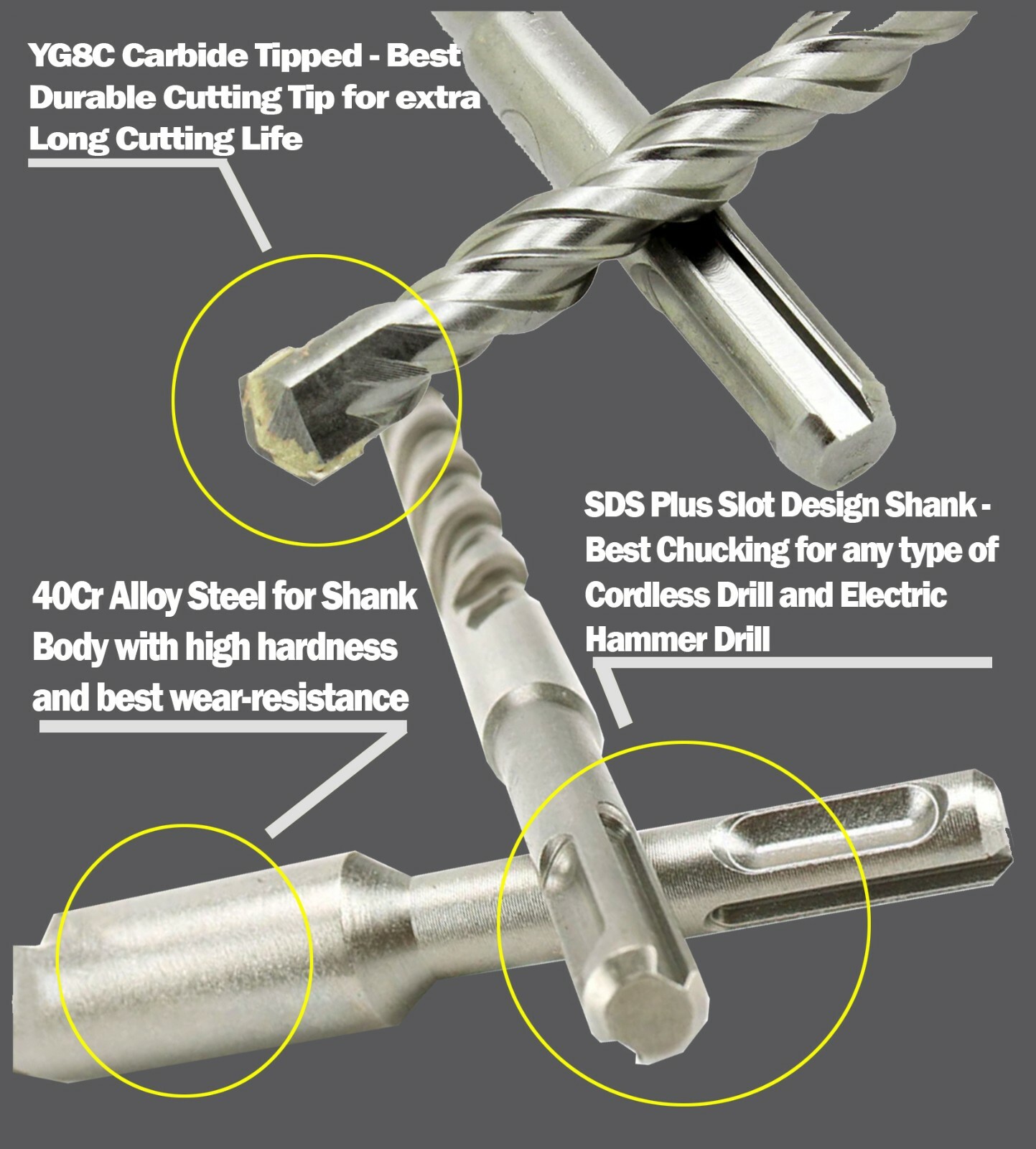✅Chucking Shank: SDS Plus shank allow best chucking in cordless drill and electric rotary hammer.