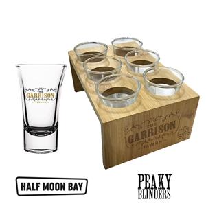 Show your appreciation for the famous Peaky Blinders watering hole with this stylish set of shot glasses and wooden holder. The holder features the Garrison Tavern logo on the end panel and holds 6 glasses. Each glass also features the popular logo, in a metallic gold finish.