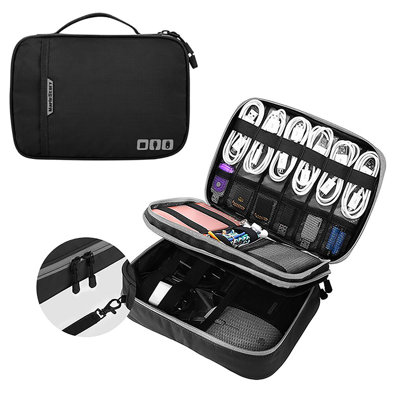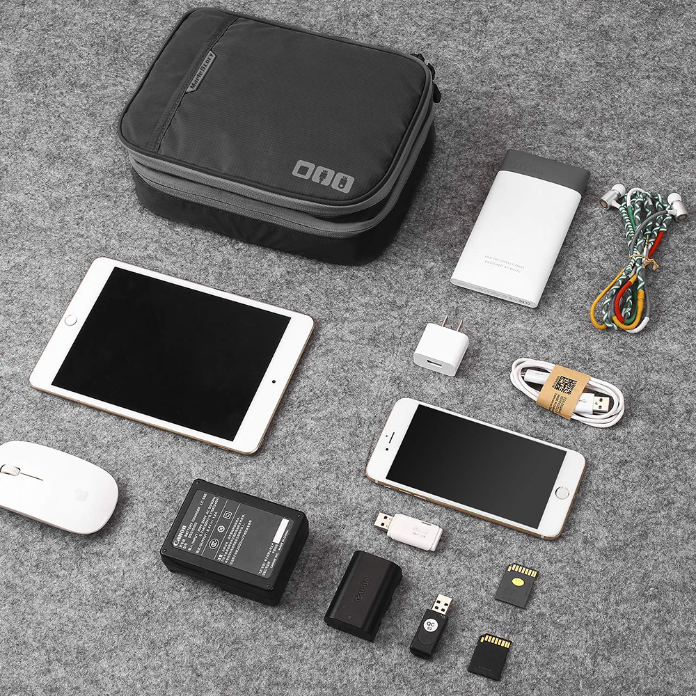 - DOUBLE LAYERS & WELL ORGANIZED- Multiple pockets and elastic sleeve of various sizes provide great flexibility for organizing electronics accessories such as USB Cable Cord, Flash Drive, Wall Charger, SD Card, Hard Drive, Power Bank, Earbuds, Camara. With two zipper mesh pockets suitable for ipad mini and iphone 12 Pro Max