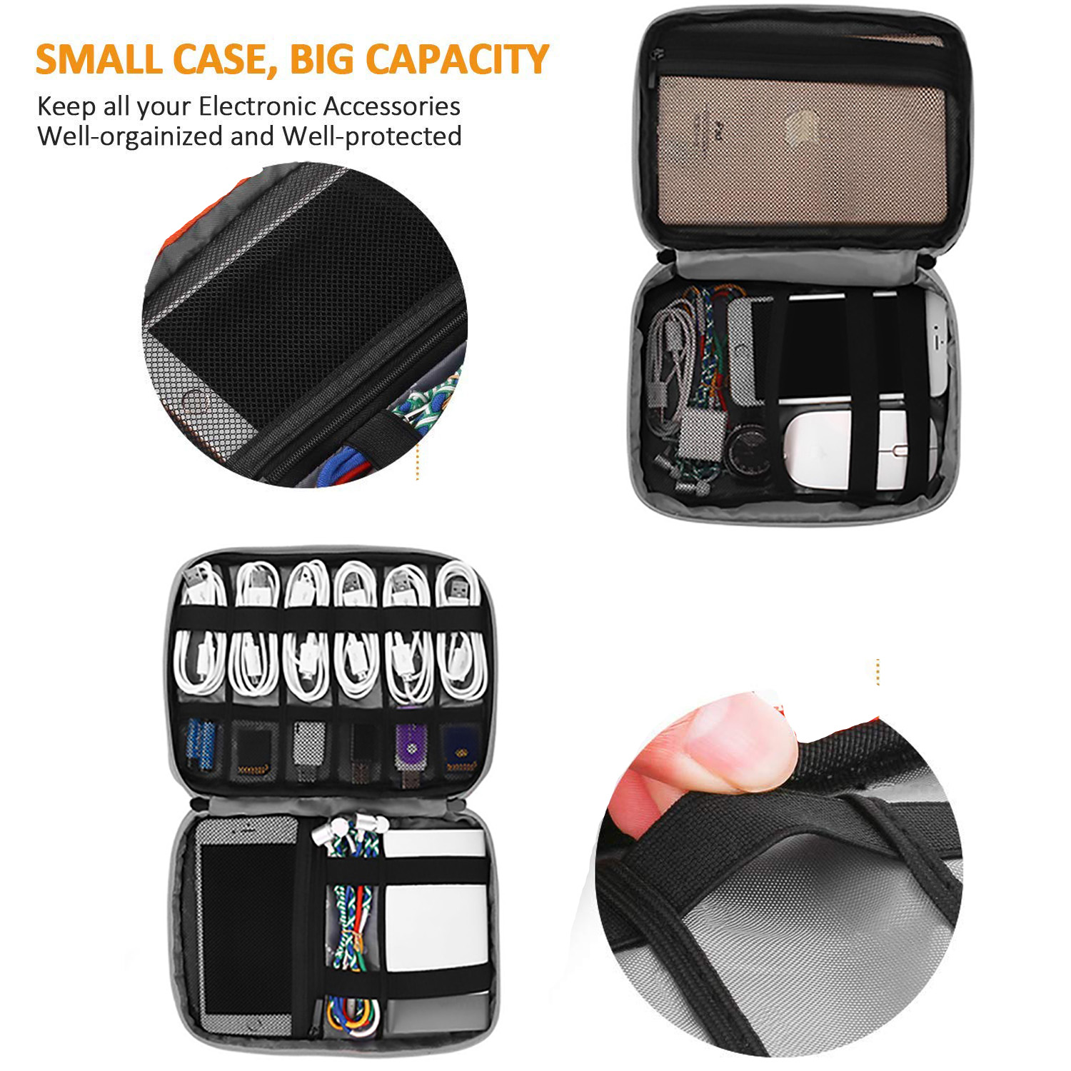 Large Size Bag with 6 elasticized mesh segments for usb drive, 2 Mesh pocket for chargers cellphones,12 elastic loops for cables, 1 big adhesive pocket for tablet iPad mini Kindle, 1 handy strap. Small Size Bag with 4x mesh pocktes for cables, phone charger, earbuds, mouse, charging brick etc. 1 Zipper padded pocket for iPhone 12 Pro Max and etc
