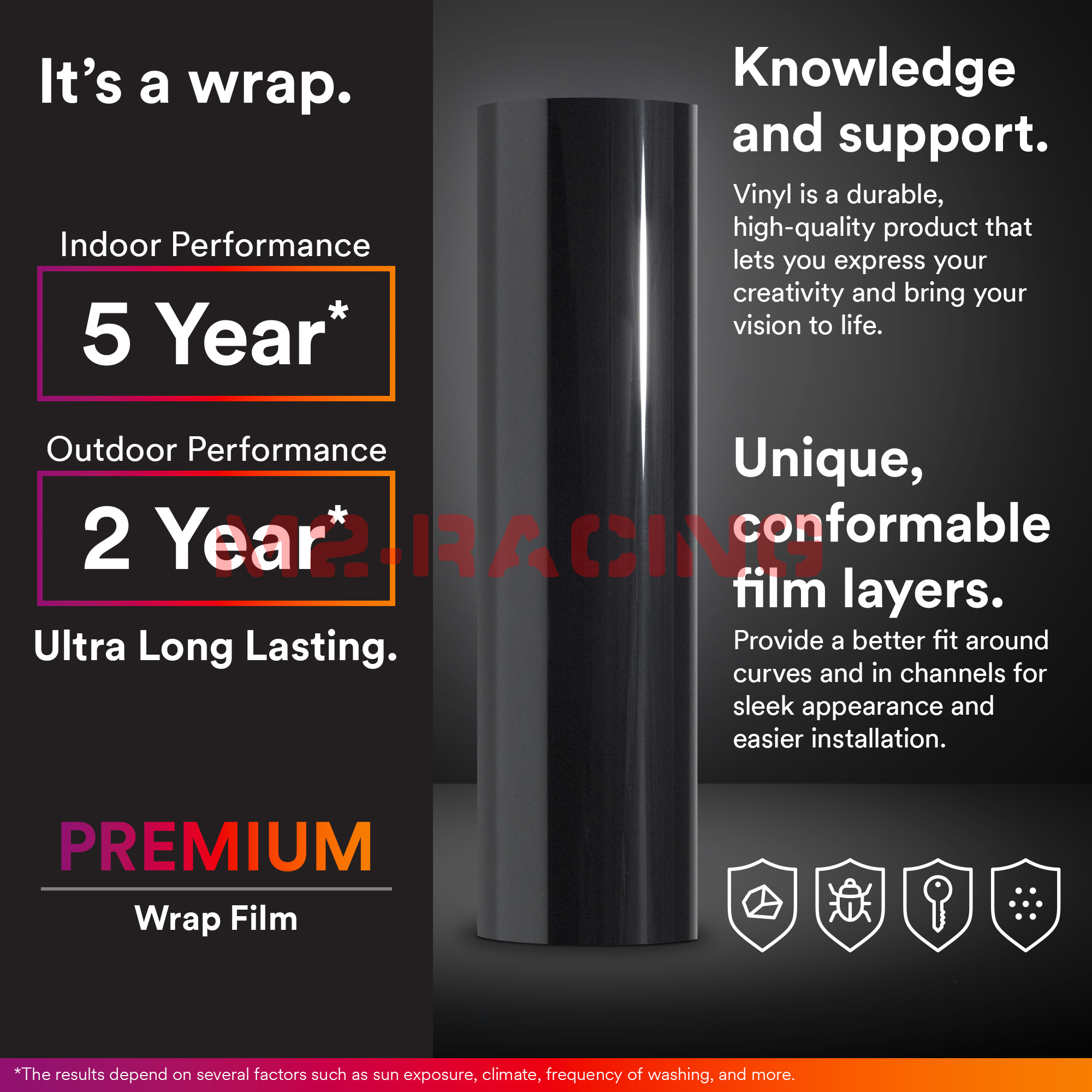- Type of film: Hybrid vinyl film with air channels (Designed for vehicle exterior with prefect paint condition)