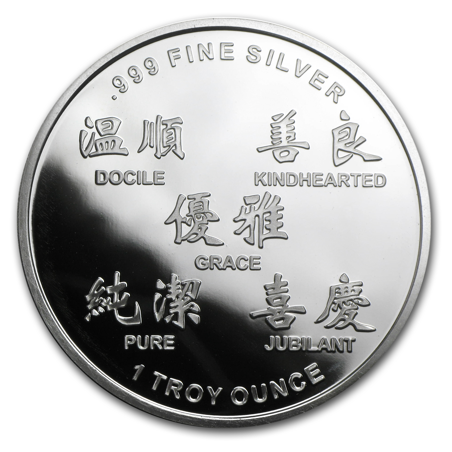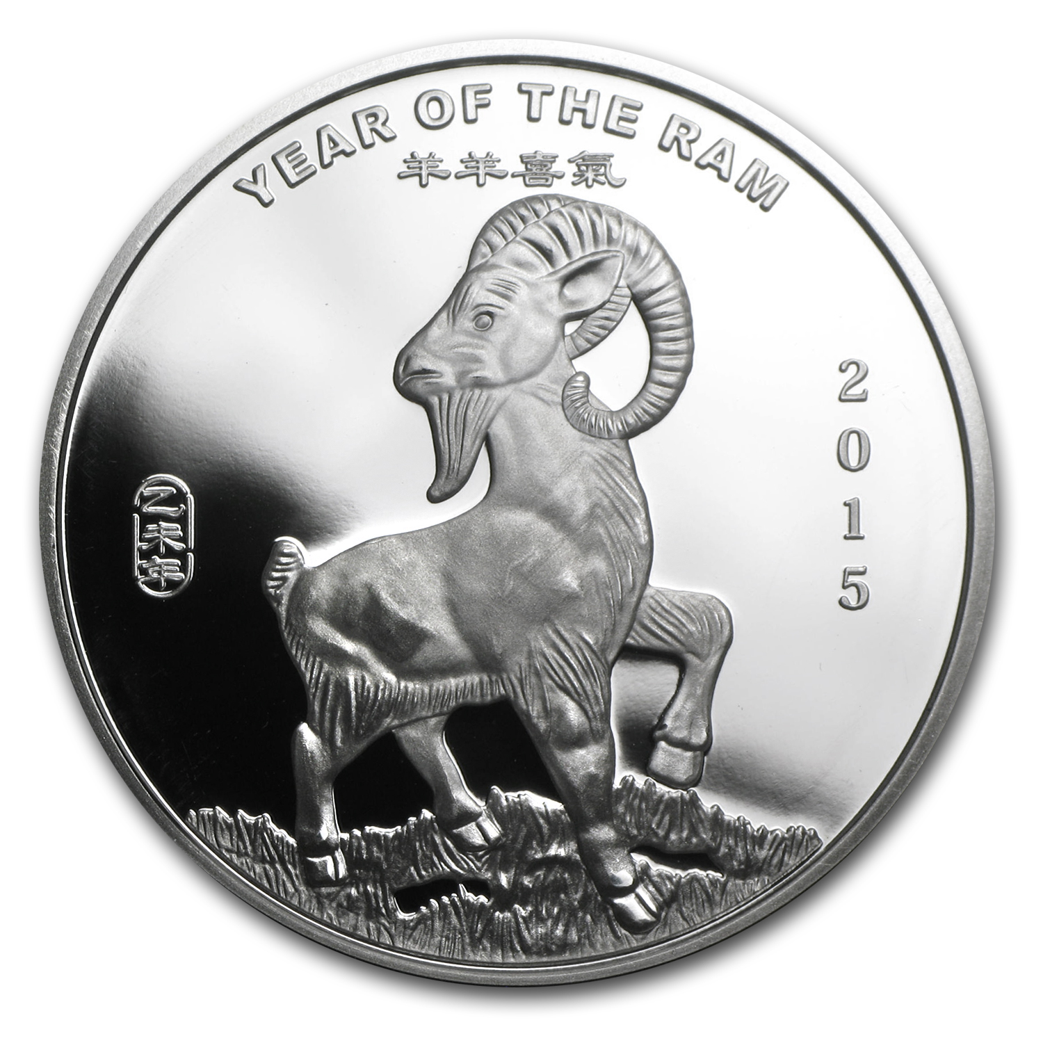 - Reverse: The Chinese characters for attributes of Year of the Ram – docile, kindhearted, grace, pure and jubilant – encircled by the weight and purity.