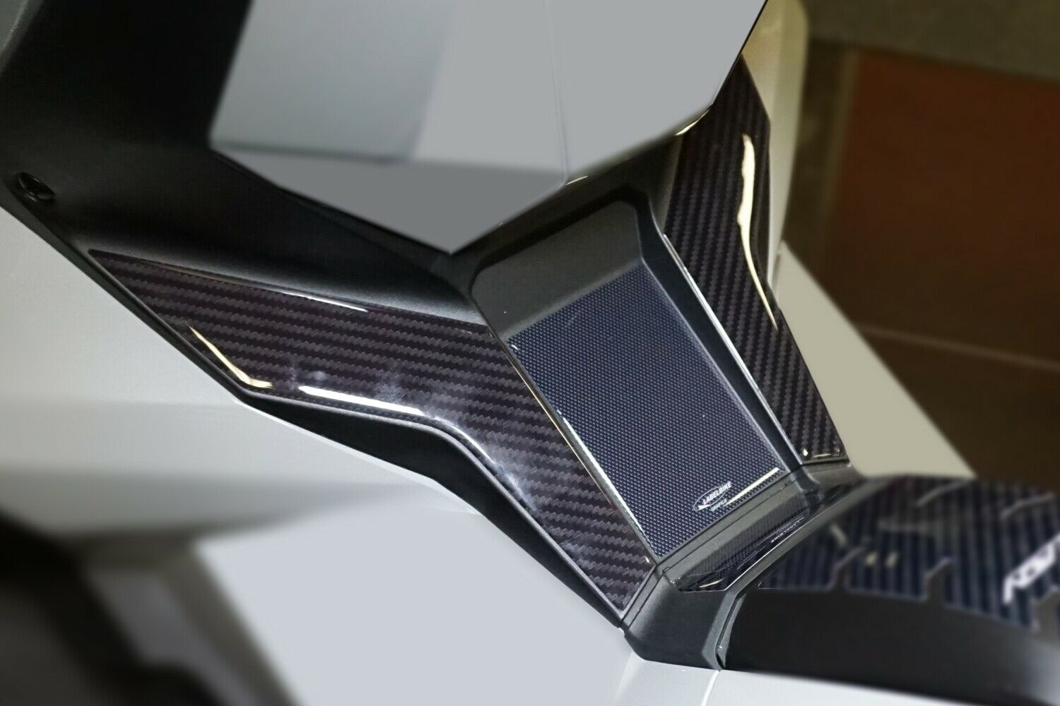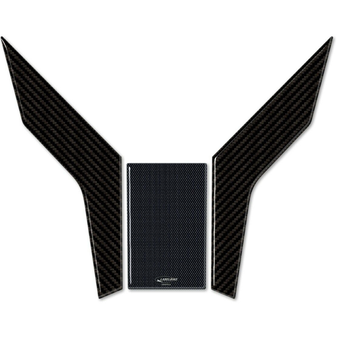 Protections de résine adhésive par zone de plate-forme centrale. Graphiques avec une base dans un non-glissement et du carbone similaires. Autocollants à effet 3D résineux, Exclusive Labelbike® fabriqué en Italie.e