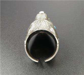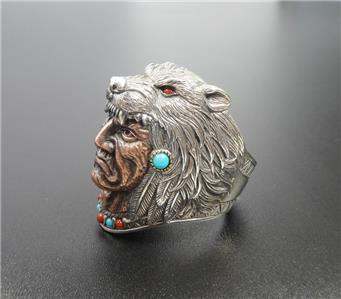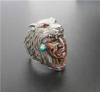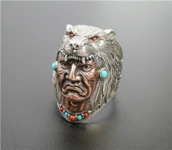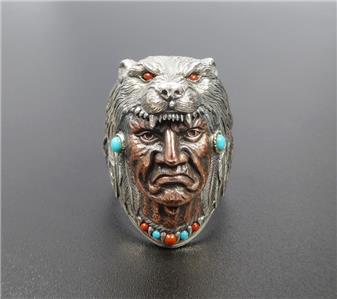 Wolf headdress Indian Chief ring handcrafted with sterling silver and brass, accented with imitation turquoise and coral. The headdress is slightly oxidized for rich antiqued finish. Amazing intricate details! Unique statement piece!