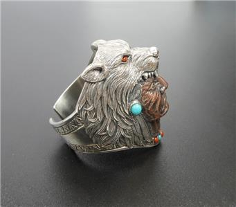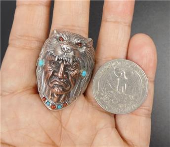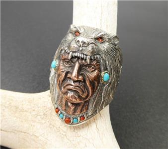 925 Sterling Silver & Brass Wolf Headdress Indian Chief Ring Size 11
