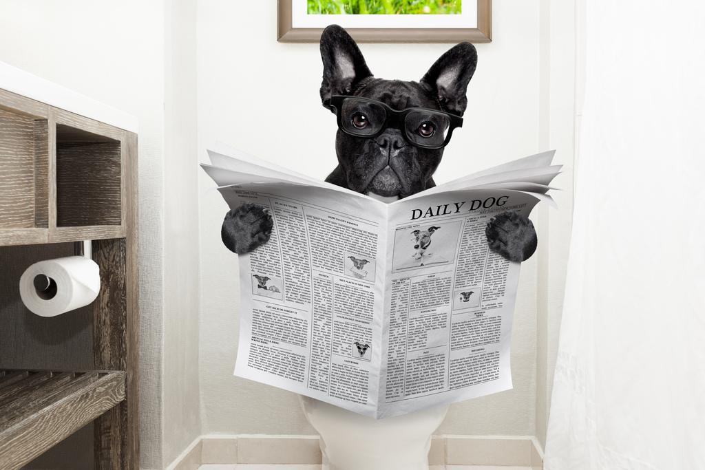 French Bulldog Dog Wearing Glasses on Toilet Seat Reading Daily Dog Breed Newspaper Funny Photo Photograph Fantasy Cool Wall Art Print Poster 18x12