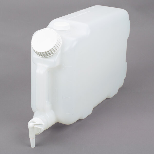 This durable plastic container features a rectangular design with a strong molded handle for carrying and transporting, making it easy to store in your facility and place securely on a shelf for convenient dispensing. The container also boasts an angled front opening for much easier filling, all while it remains planted on your shelf or table. With its easy-to-dispense spout, both storing and dispensing has never been more convenient!