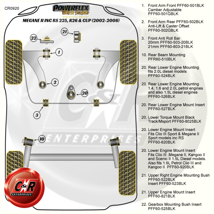 Para ayudar a identificar los casquillos Powerflex correctos que necesita, consulte el diagrama de ubicación más abajo en la lista.