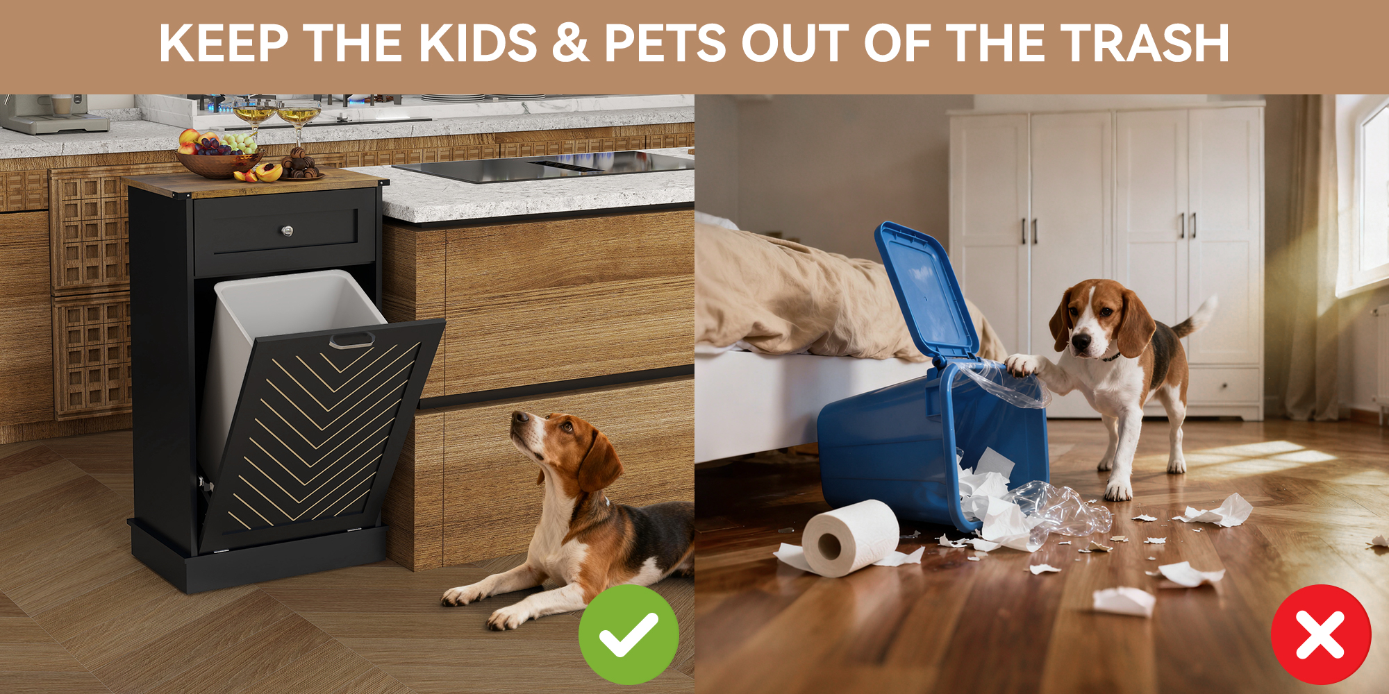 【Hidden Design】-- The kitchen cabinet hides trash cans to keep your pets away from trash and makes your kitchen clean and tidy, say goodbye to the mess created by pets!