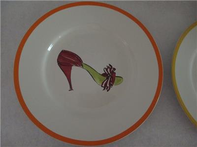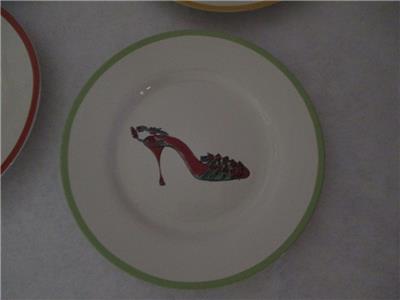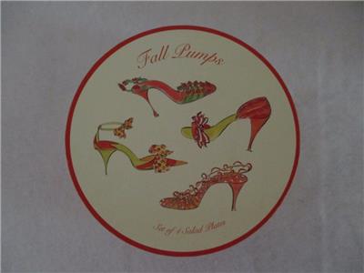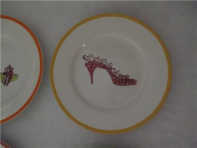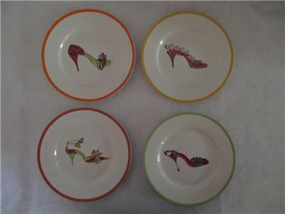 This auction is for a 4 piece set of Rosanna made in China salad plates with pumps, high heel shoes pattern. Each plate is a different color with a different pump. New in the box. See photos. Don't mind the glare in the photos. Makes a great gift. 4 plates measure 8.25" each.