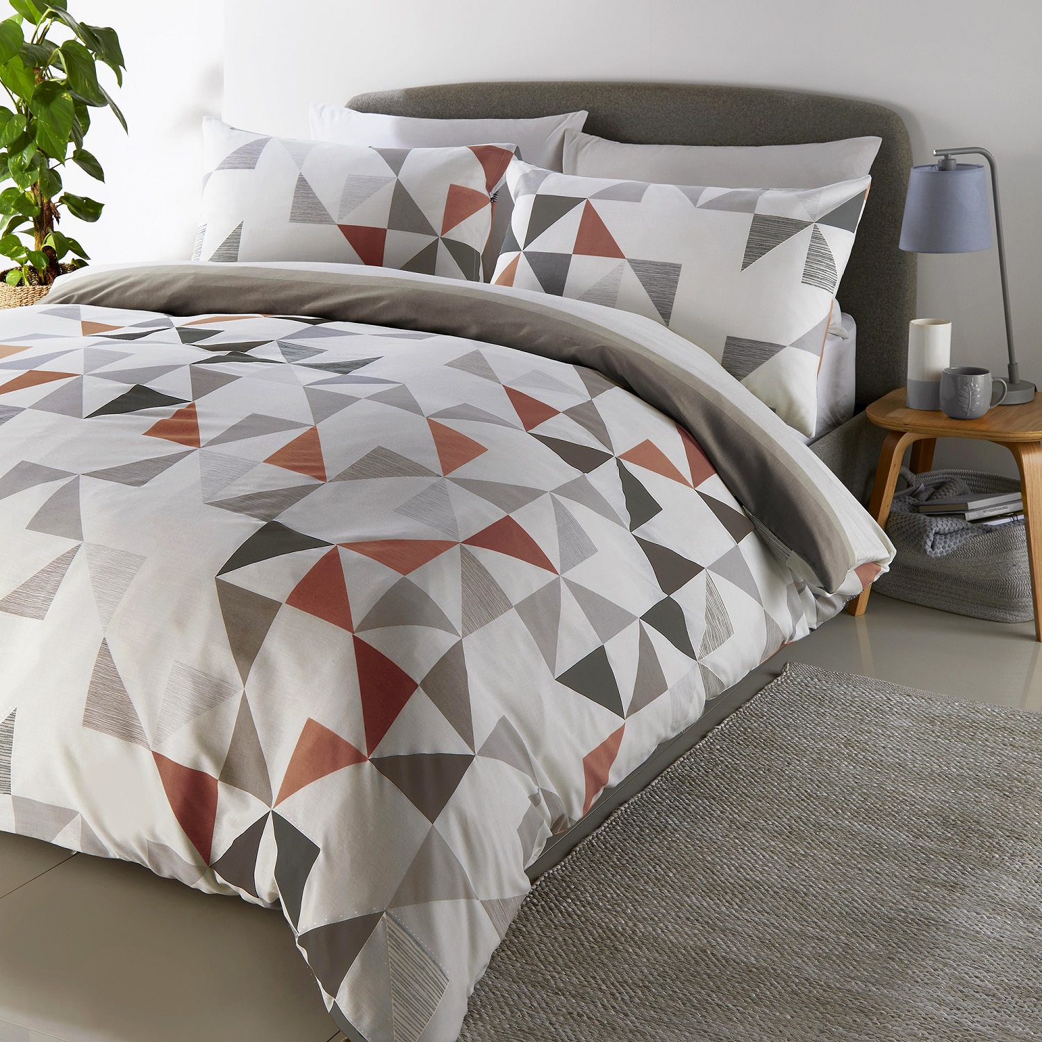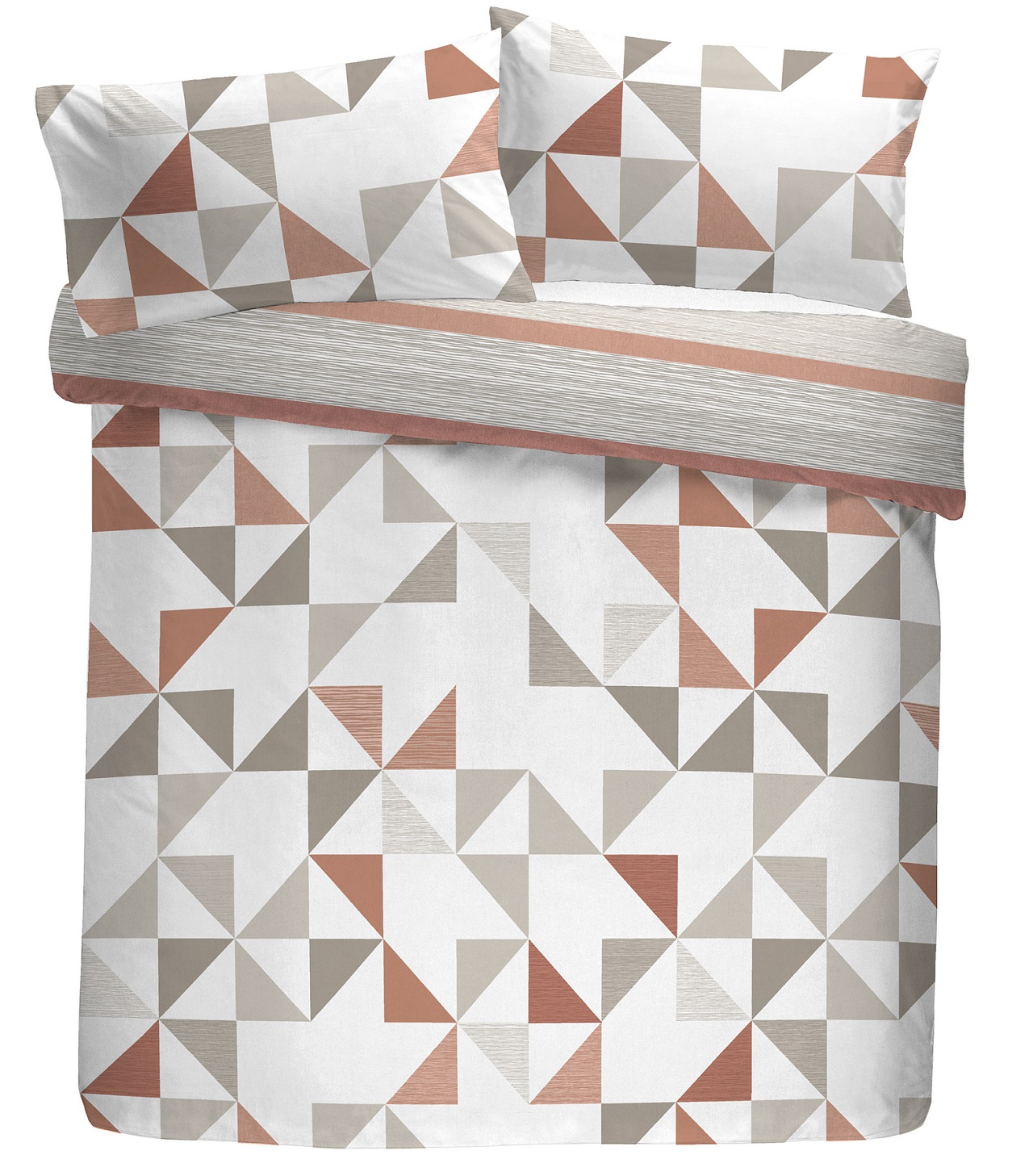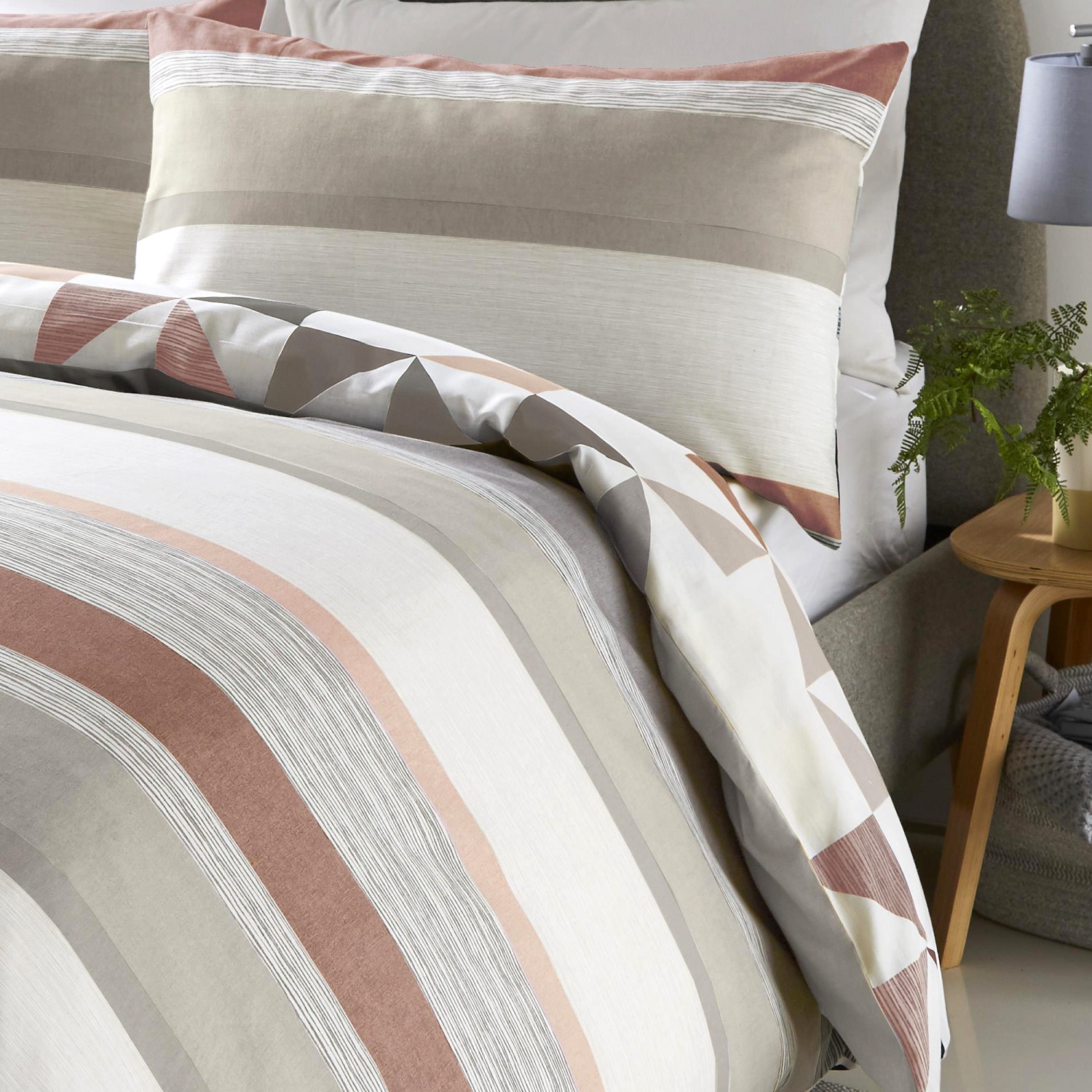 This luxury duvet cover set has a contrasting reversible triangle geometric and striped design with a modern terracotta and natural colour palette suitable for today's contemporary bedrooms. It is printed on easy-care polycotton fabric. Material is 48% cotton & 52% polyester and it is machine washable.