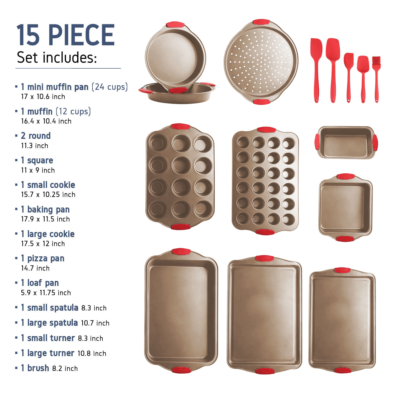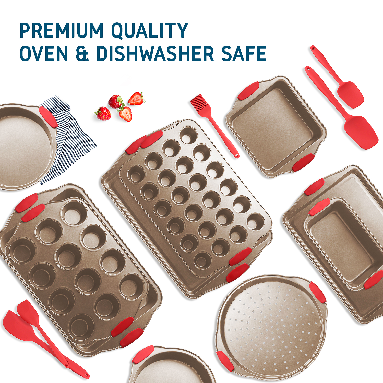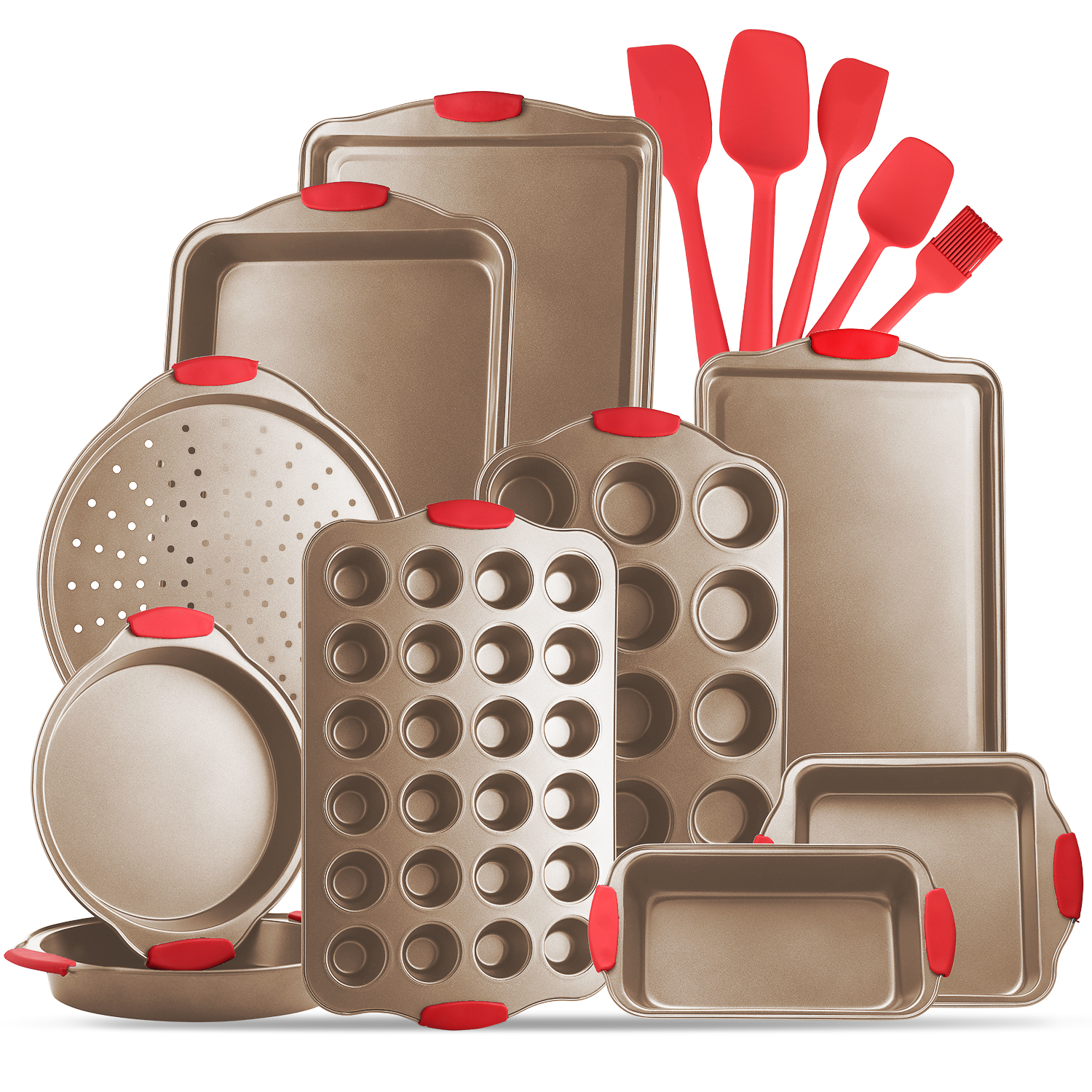 Safe N Comfort Silicone Handles: The commercial-grade restaurant-quality kitchen bakeware features red silicone grips on all bakeware pans to prevent burns and offer you offer plenty of solid, comfortable grasp, even with potholders. We also included an extra set of 5 silicone spatulas to help you out with your delicious baking!