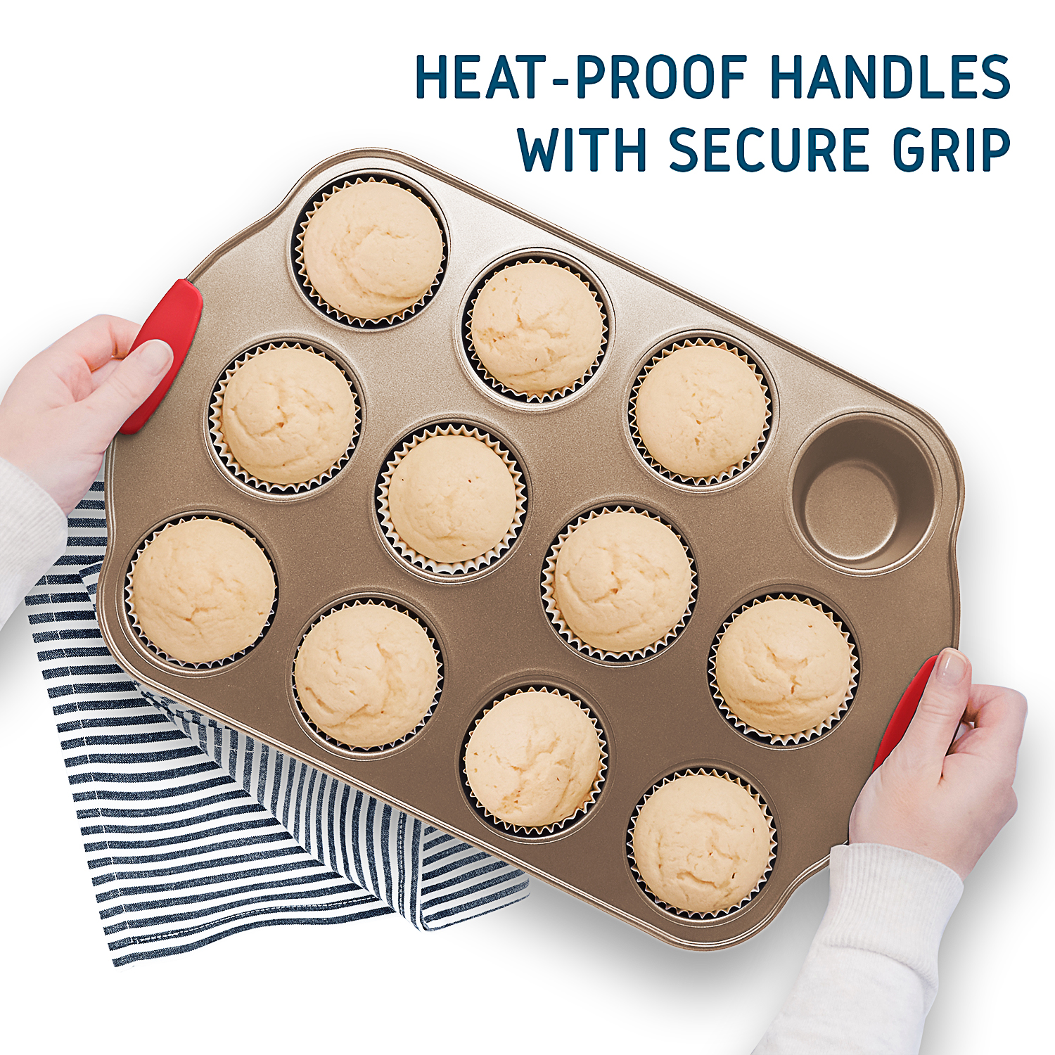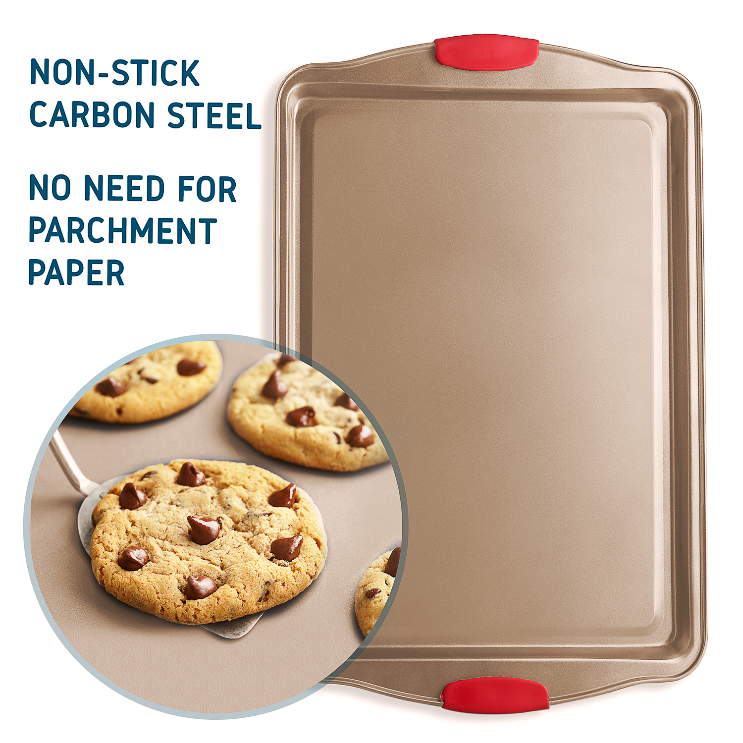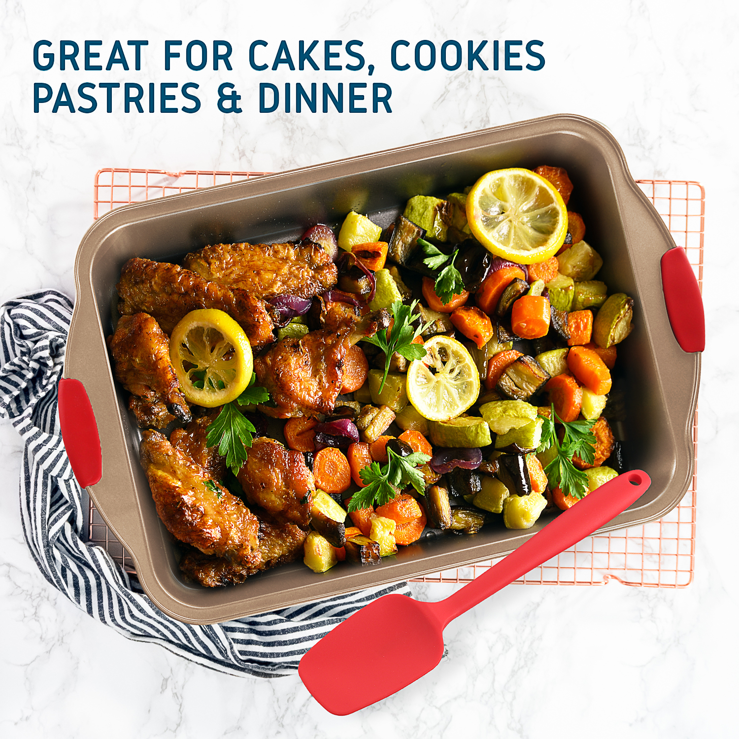 Safe N Comfort Silicone Handles: The commercial-grade restaurant-quality kitchen bakeware features red silicone grips on all bakeware pans to prevent burns and offer you offer plenty of solid, comfortable grasp, even with potholders. We also included an extra set of 5 silicone spatulas to help you out with your delicious baking!