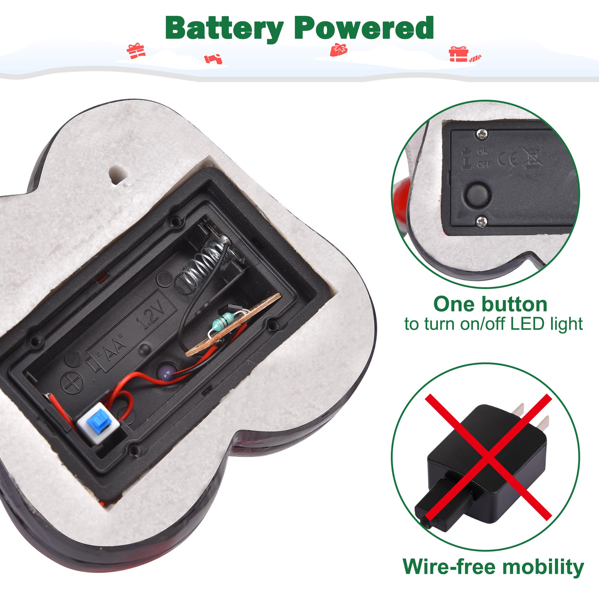 - Battery Powered - One button to turn on/off the LED light via switch in the bottom, no power cord for ensuring convenience and wire-free mobility, can be placed anywhere you want to decorate without restrictions