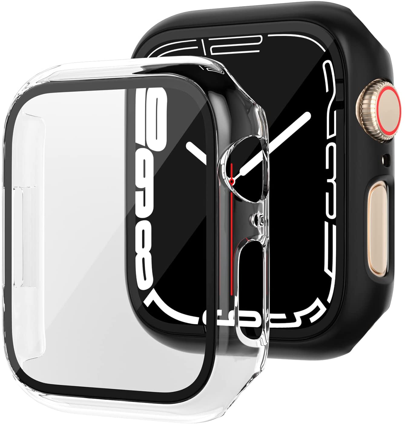 - Compatible Models - Perfect accessory case with screen protector created for Apple Watch Hard PC Black/Clear built Glass Film for 45mm/41mm Series 7. The accurate back hollow of the protective case makes the iwatch directed charging with case on, don't need to take off the case.There are two colors, black and clear.Great for outdoor sports / business / parties / shopping /gifts ect. No age limited.