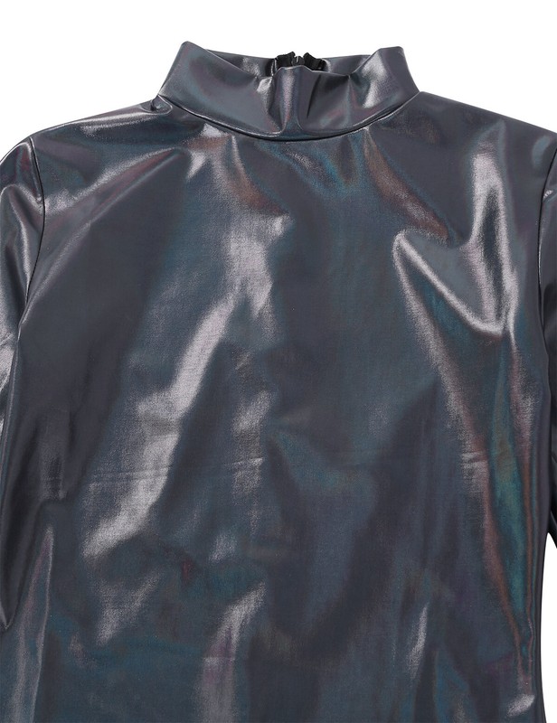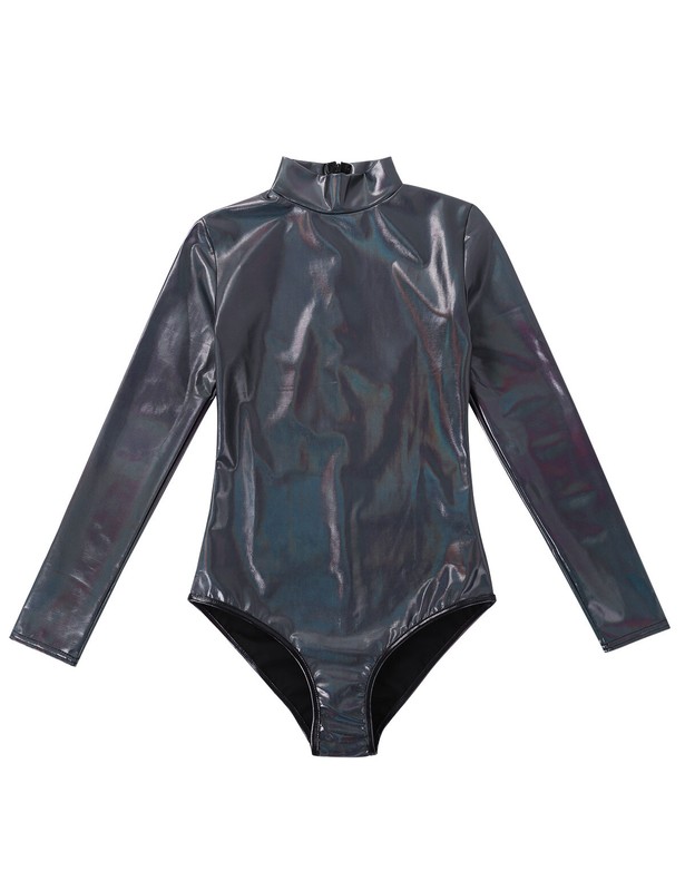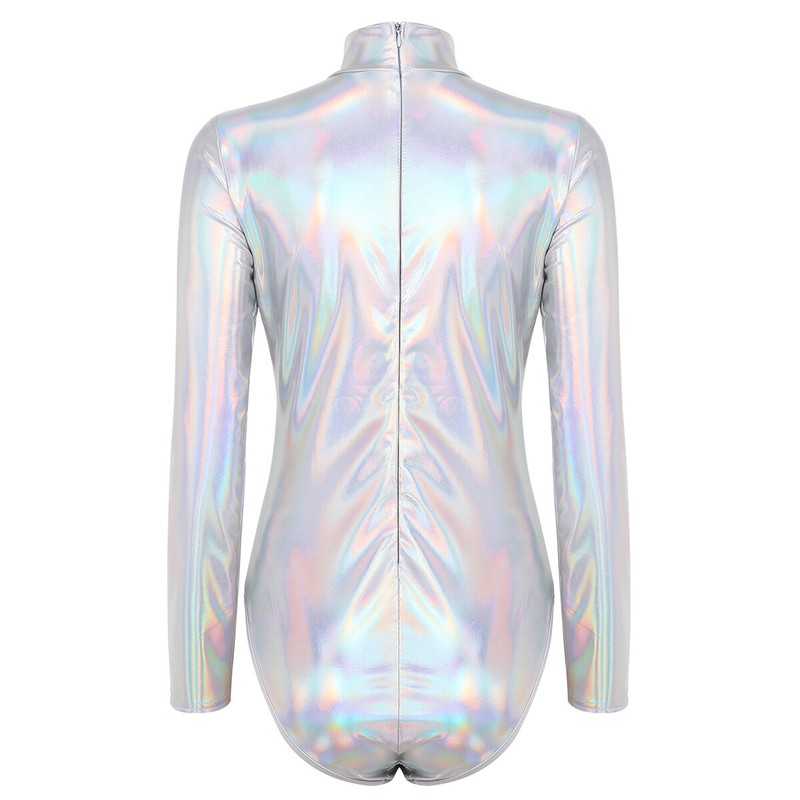 Women’s one-piece shiny metallic gymnastic dance leotard bodysuit, concealed back zipper closure.
