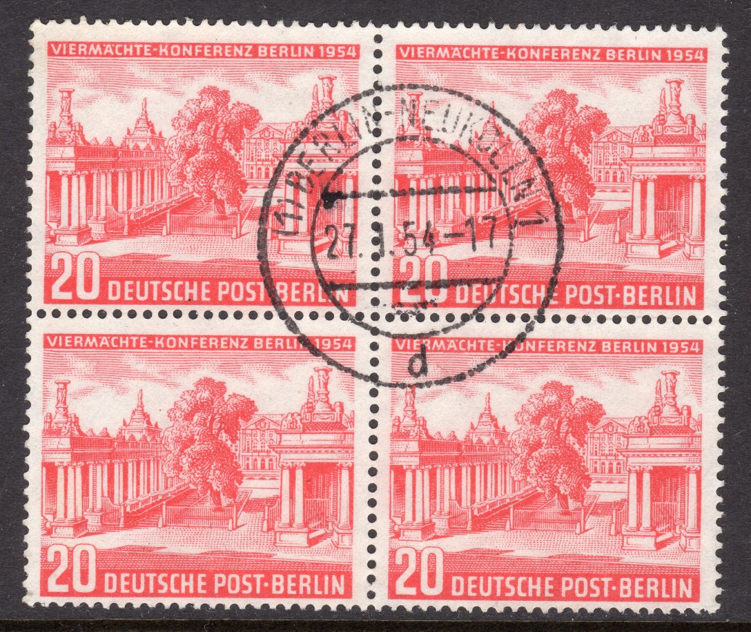 Germany Berlin Scott #9N103 VF Used 1954 Four Power Conference Berlin Block of 4. Multiple wins will have shipping combined for a reduced rate. Many of my lots are for stamps that I have multiple copies of. For that reason, the photo may not be the exact stamp you will receive, particularly with the more common items. Please ask if it is important that you receive the pictured stamp.
