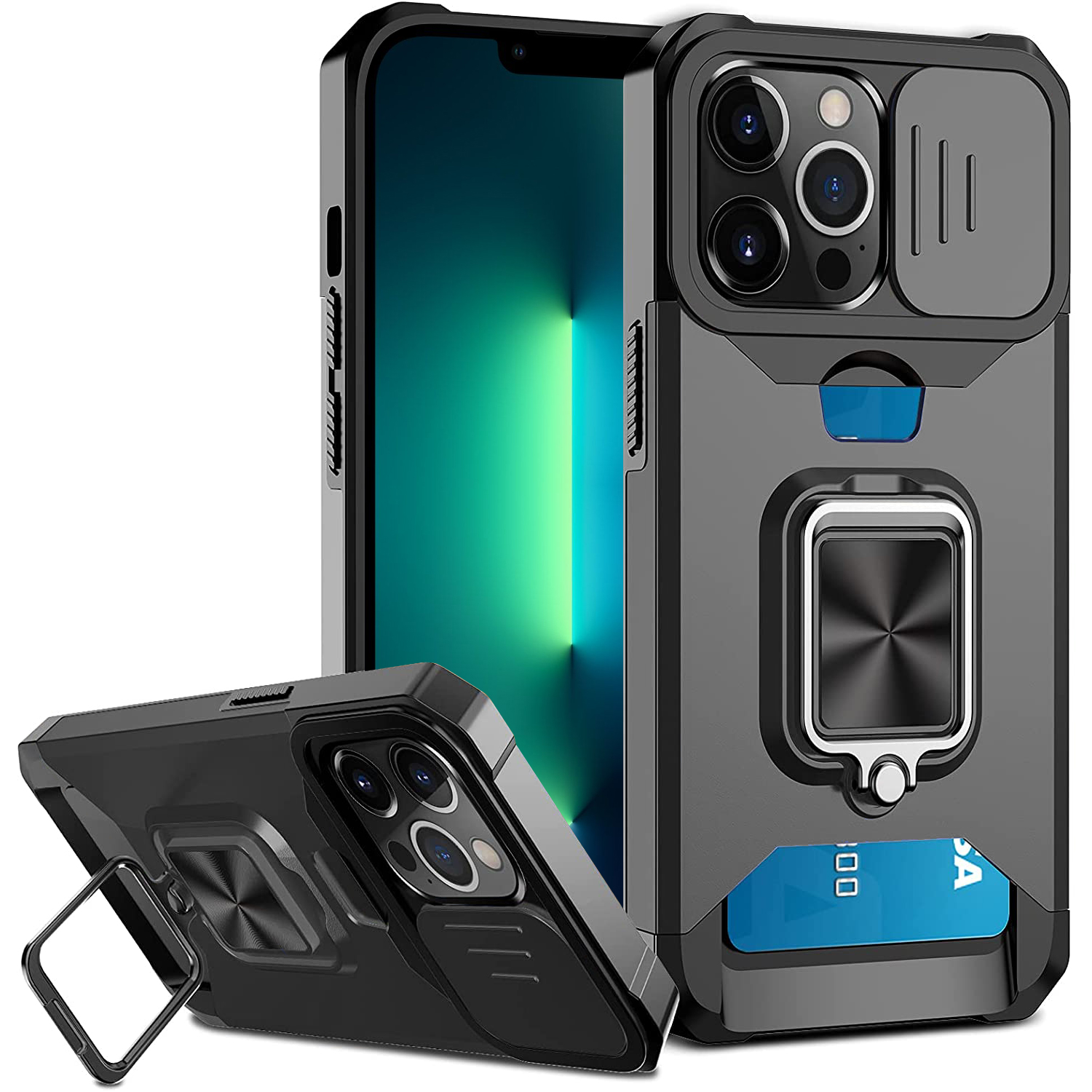 - 1x Armor Case Camera Cover & Rotate Ring Stand & Magnetic & Card Holder Slot for iPhone - Black