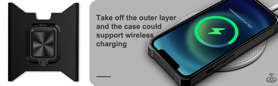 - Metal Magnetic Fuction - The phone case also has a built-in magnetic plate, which can be directly adsorbed to the magnetic car mount holder for navigation when driving.The back ring kickstand dose not support wireless charging,You need to take off the outer layer and the case could support wireless charging.