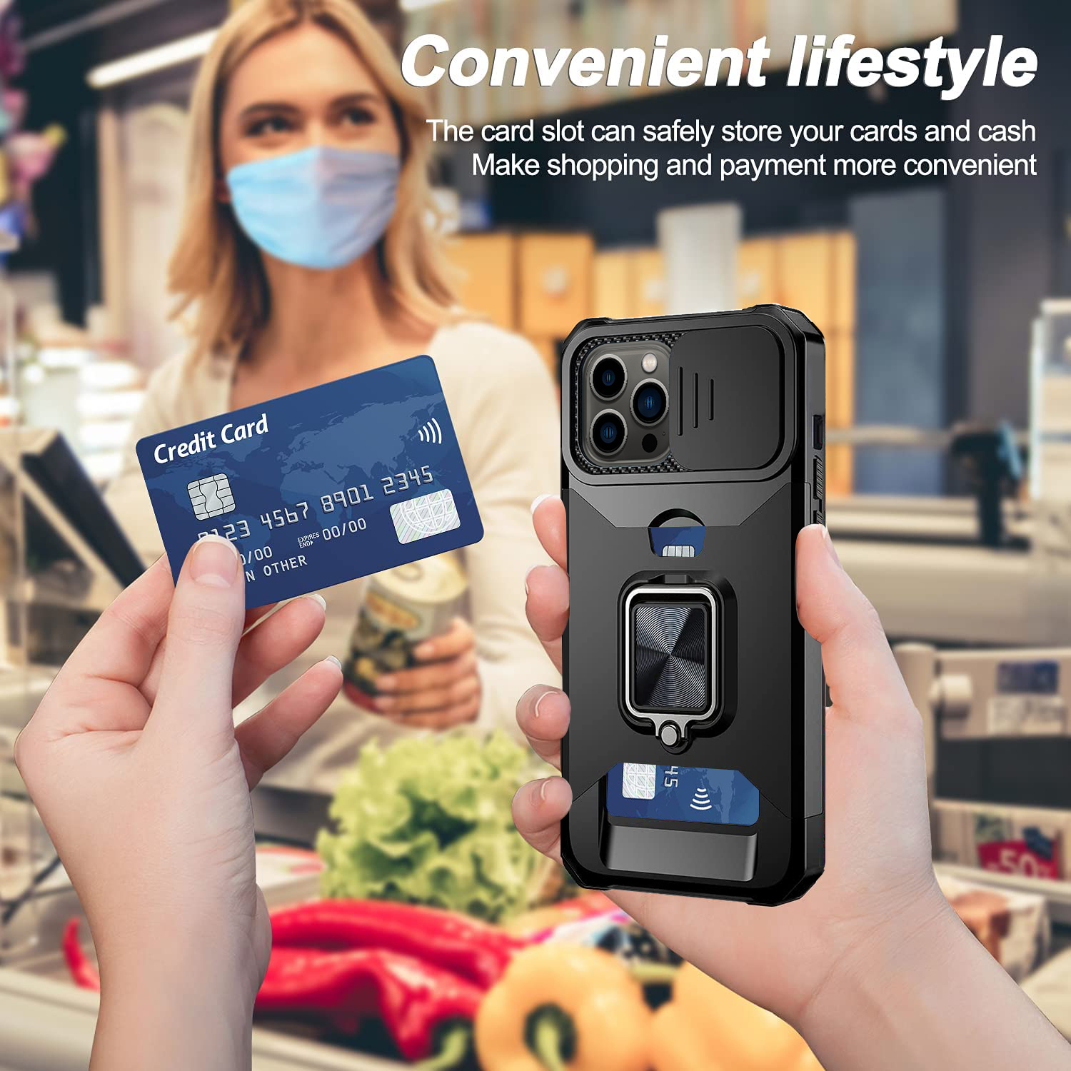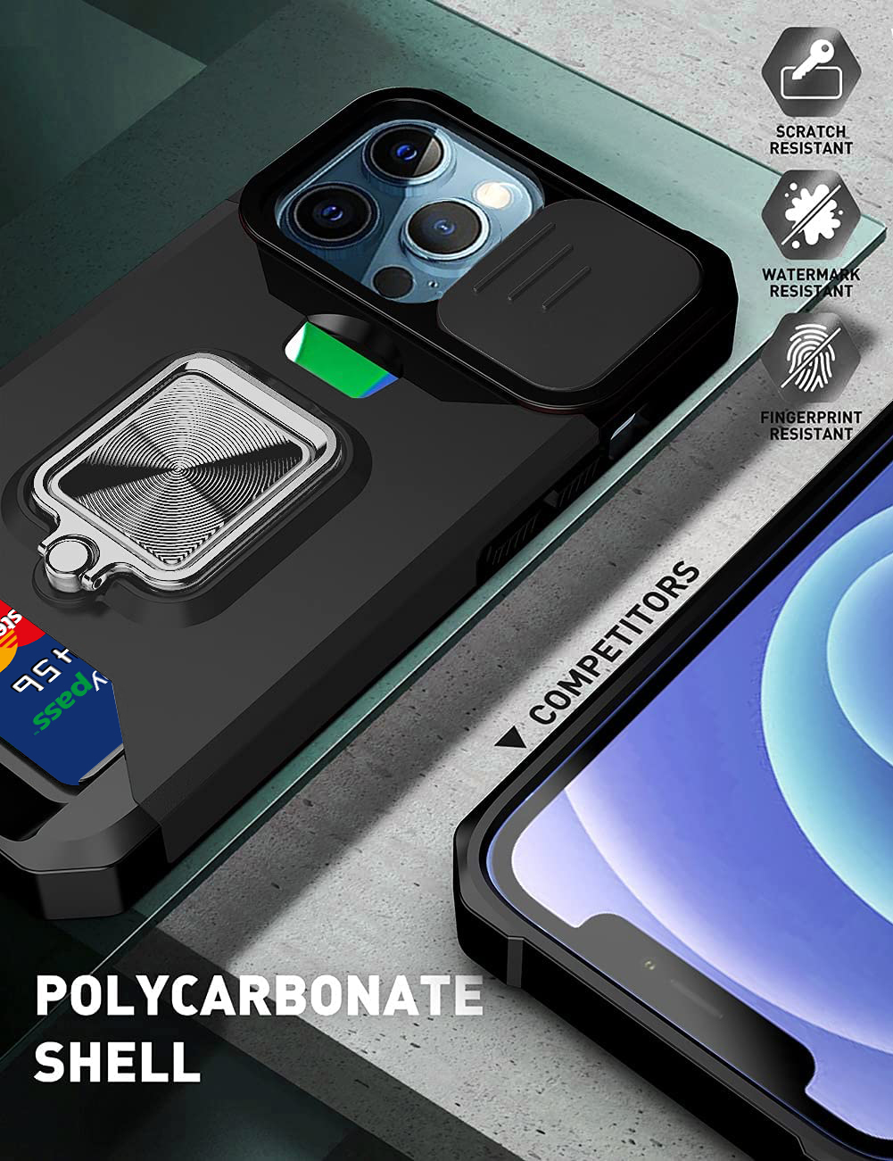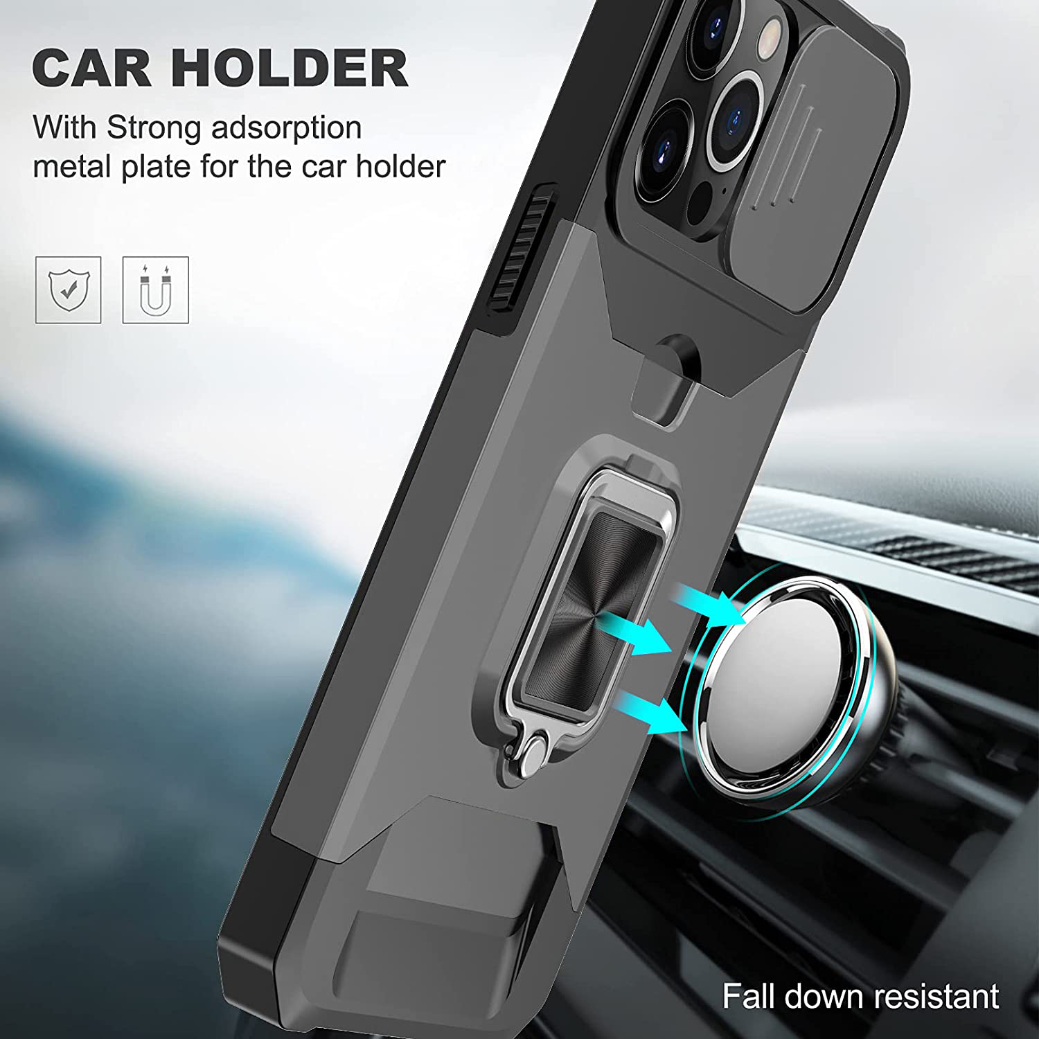 Armor Case Camera Cover & Rotate Ring Stand & Magnetic & Card Holder Slot - Black