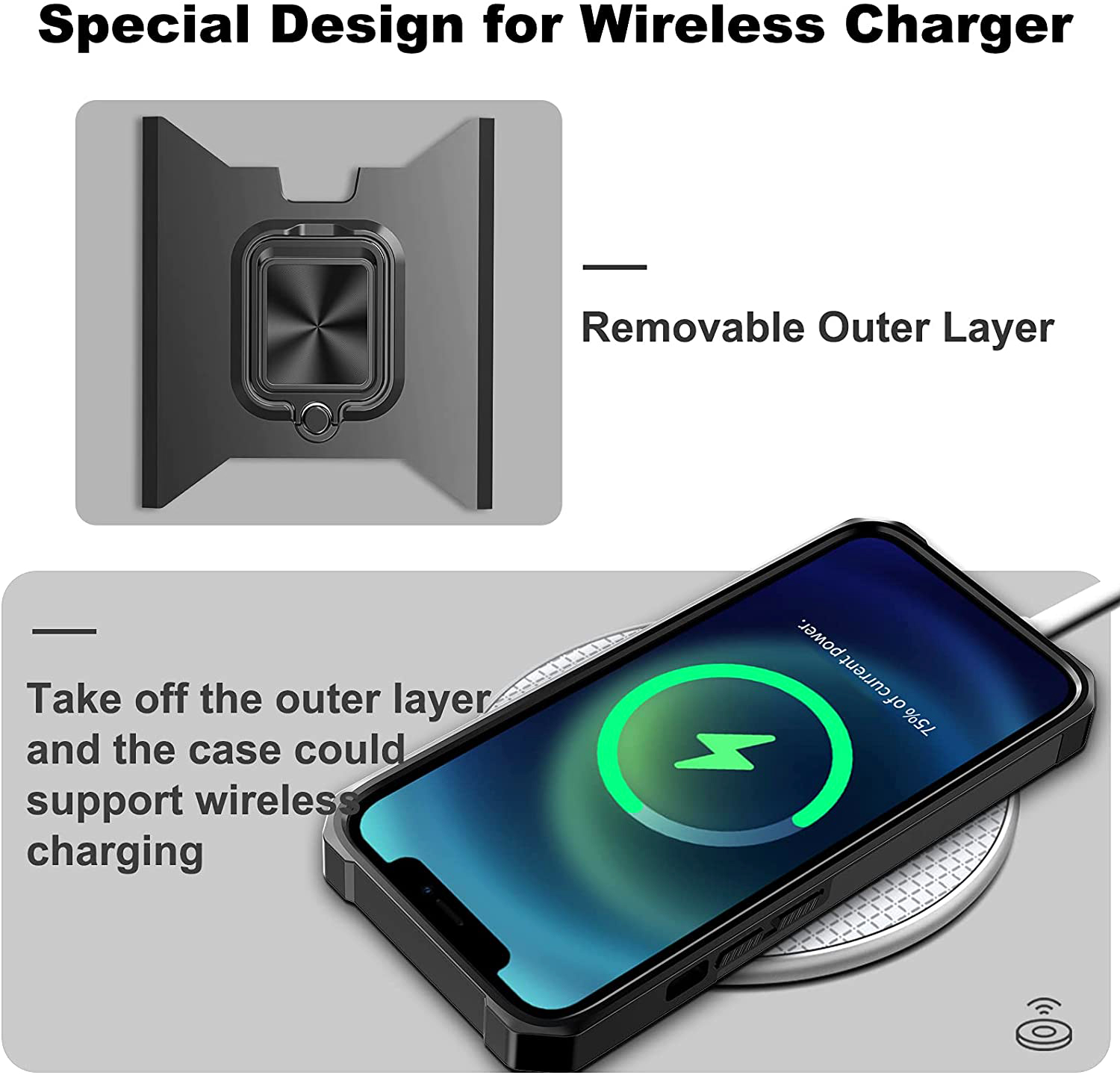 1. The back ring kickstand dose not support wireless charging, You need to take off the outer layer and the case could support wireless charging.