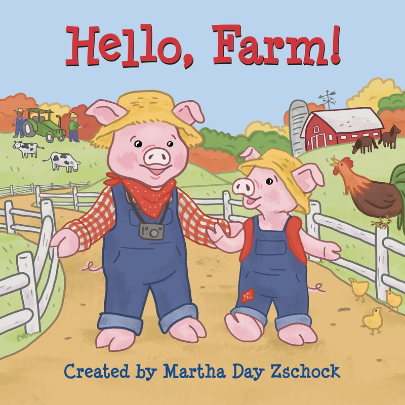 In Hello, Farm!, parent and child pig and piglet spend a day on the farm in best-selling author-illustrator Martha Day Zschock's Hello! board book series for children. In Hello, Farm!, join the pair as they encounter the sights and sounds of the barnyard, visiting with chickens, sheep, goats, cows, ducks, geese, and the farmer himself! Along the way, take a hayride, follow a tractor through the fields, milk the cow, and say hi to the scarecrow! For ages 0-3. Made in the USA.