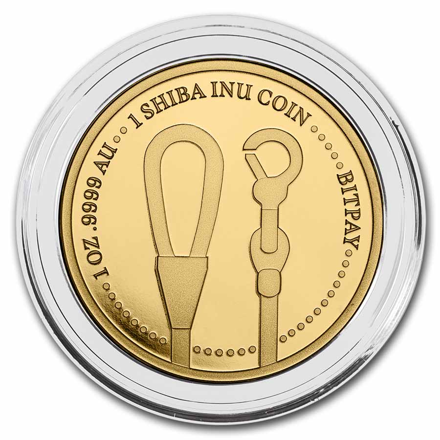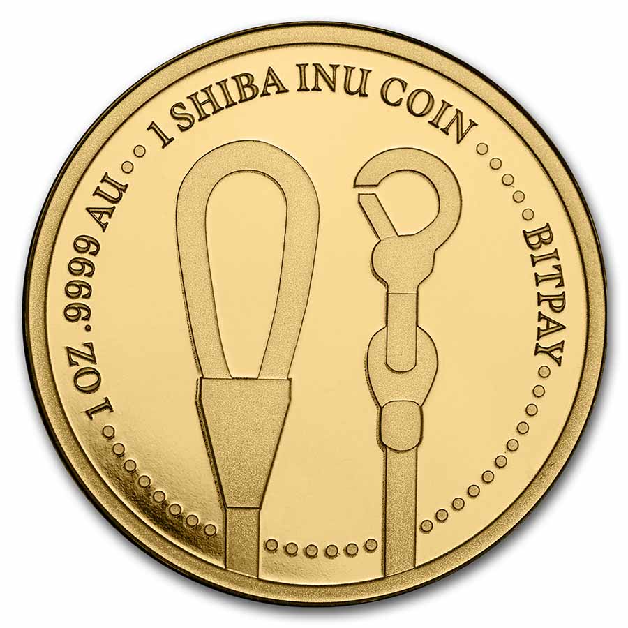 - Reverse: Features the loop and clasp elements of a dog leash. 1 SHIBA INU COIN, BITPAY, weight and purity are displayed along the edge.