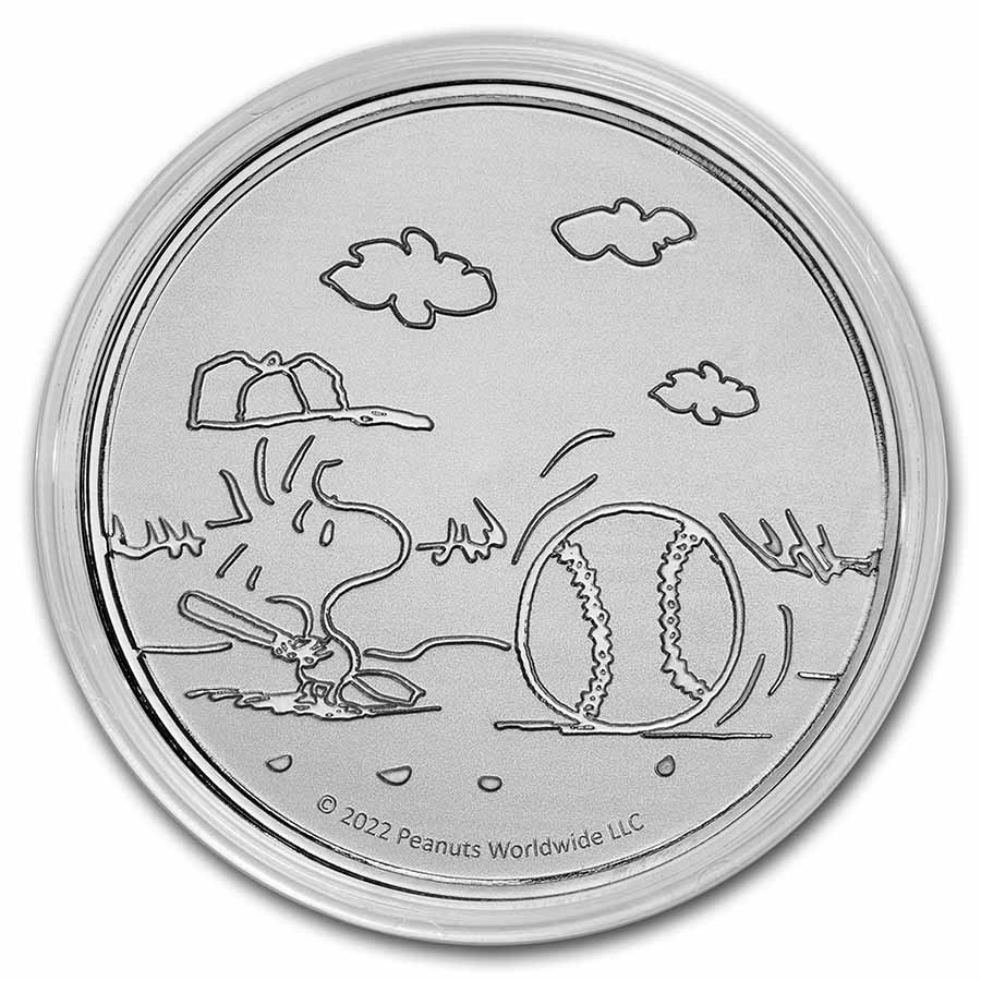 - Obverse: Depicts an officially licensed image of Woodstock standing somewhat timidly with a baseball bat as his ball cap pops from the top of his head with surprise upon seeing the large baseball roll his way. Below is the Peanuts Worldwide® copyright.