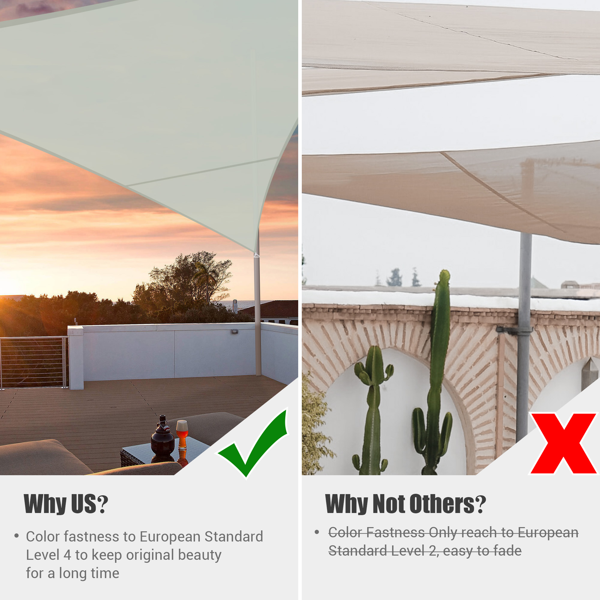 - Durable in Use - Double stitched seam reinforces the edge to prevent fraying and ripping; Curved triangle shape helps the sail to keep tight; Color fastness up to European Standard Level 4 to keep long-lasting beauty under sun exposure; 2-year warranty for quality issue