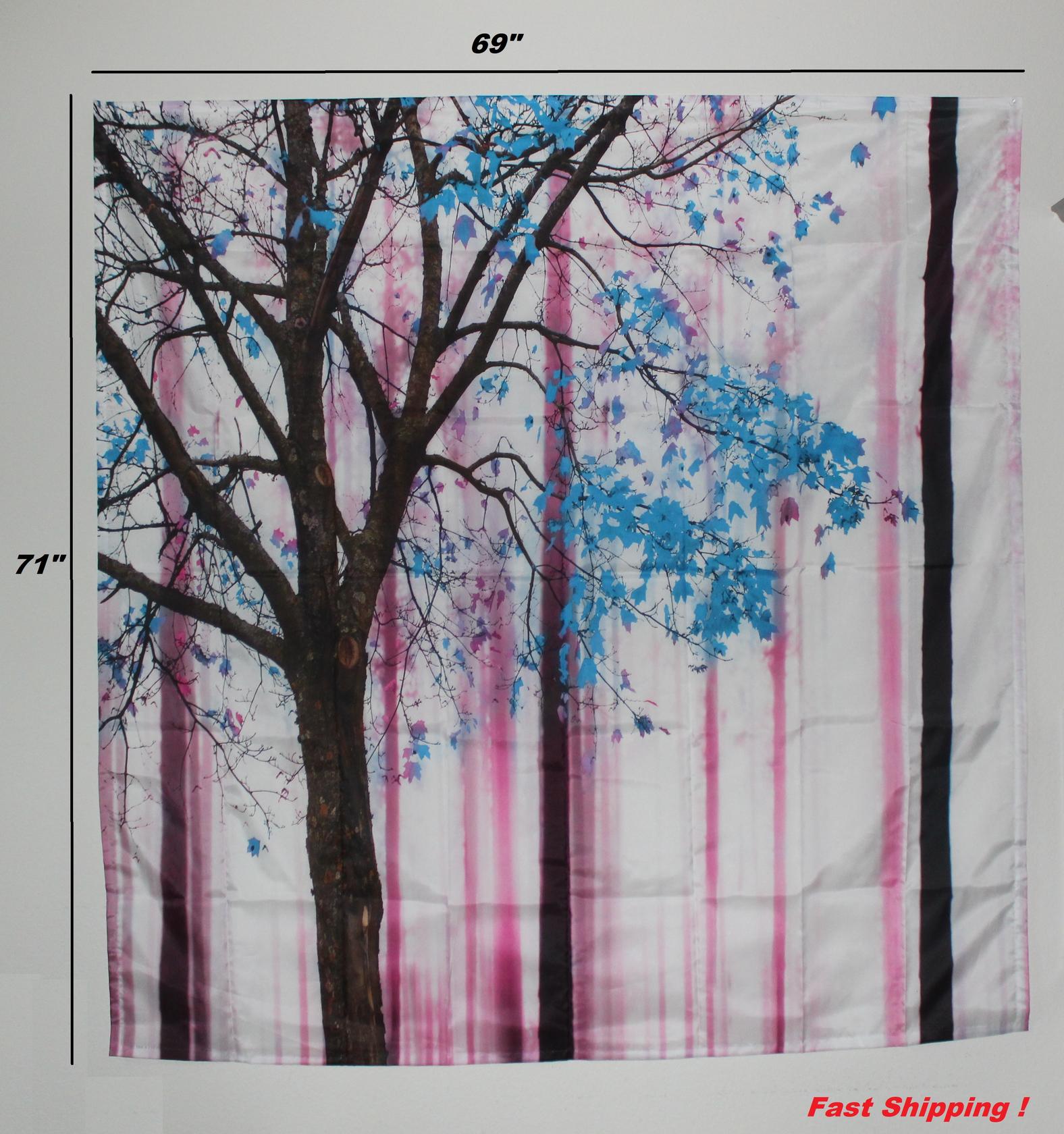 Woodland Shower Curtain, Trees Blue Leaves Fall w/ Hooks, 69" W x 71"